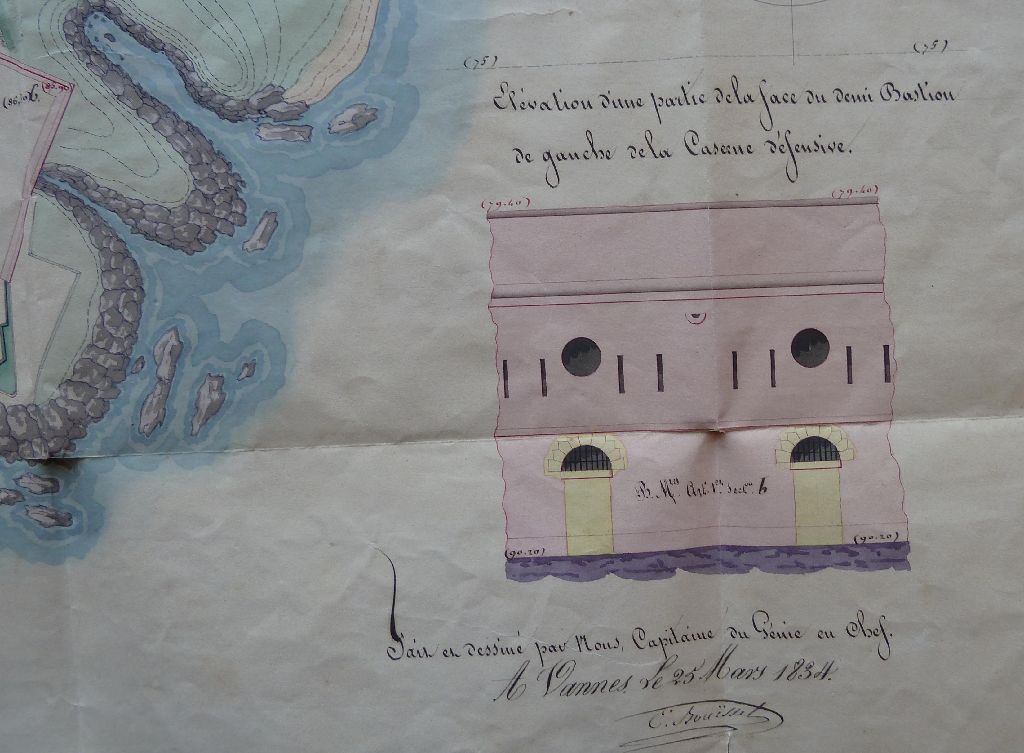 Service historique de la Défense, département Armée de Terre, Vincennes. Archives du Génie ; Article 8, Places françaises et d'Algérie : 1 VH 1516, Place de Quiberon, projets et dépenses annuels, 1823-1837. Direction du Génie de Nantes, Place de Quiberon, feuille des projets pour 1834, plan général du fort Penthièvre et de son camp retranché, 25 mars 1834.