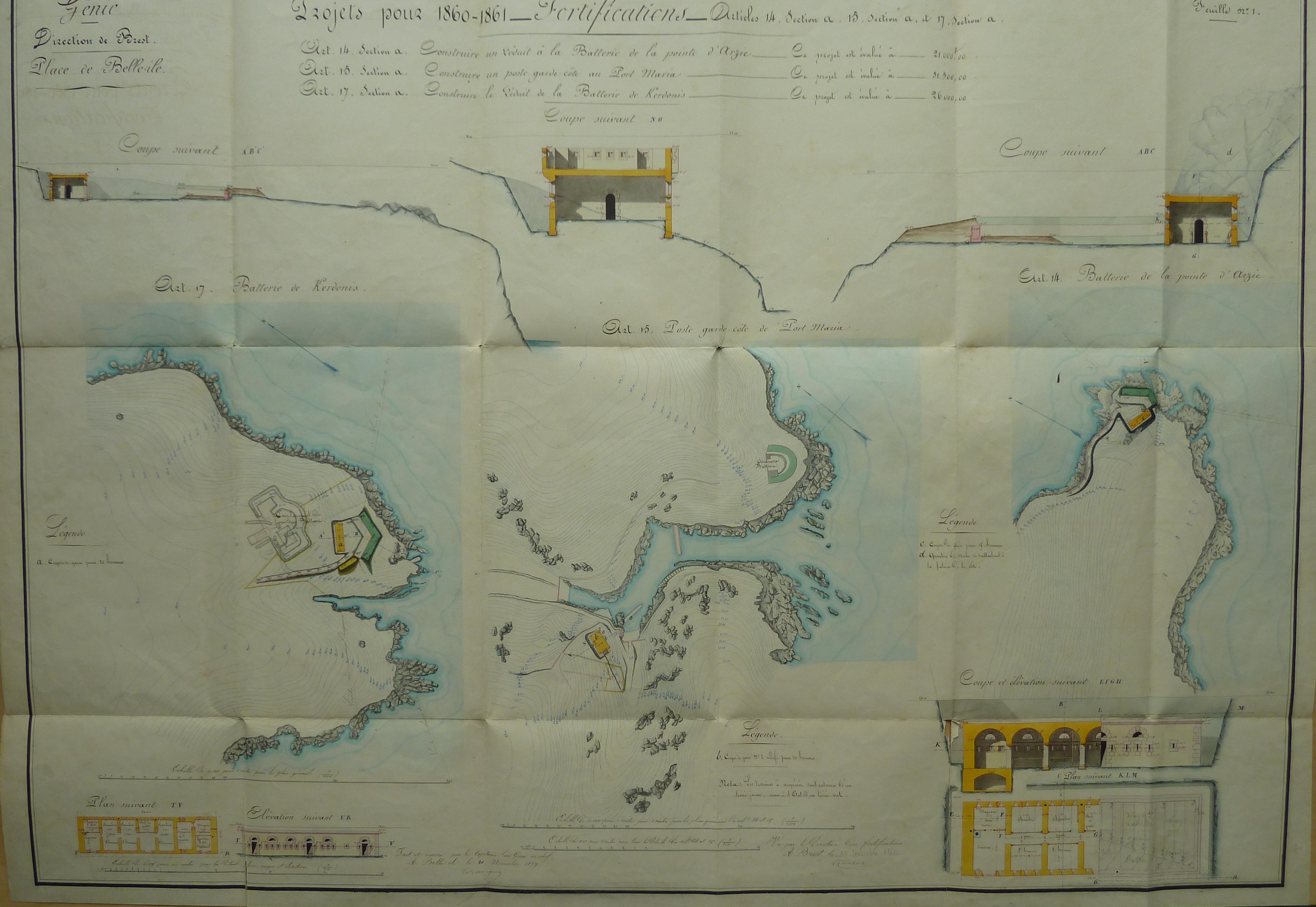 Service historique de la Défense, département Armée de Terre, Vincennes. Archives du Génie ; Article 8, Places françaises et d'Algérie : 1 VH 296, Place de Belle-Île-en-Mer, projets et dépenses annuels, 1860-1861. Direction du Génie de Brest, Place de Belle-Ile, feuille n° 1 des projets pour 1860-1861, 20 novembre 1859.