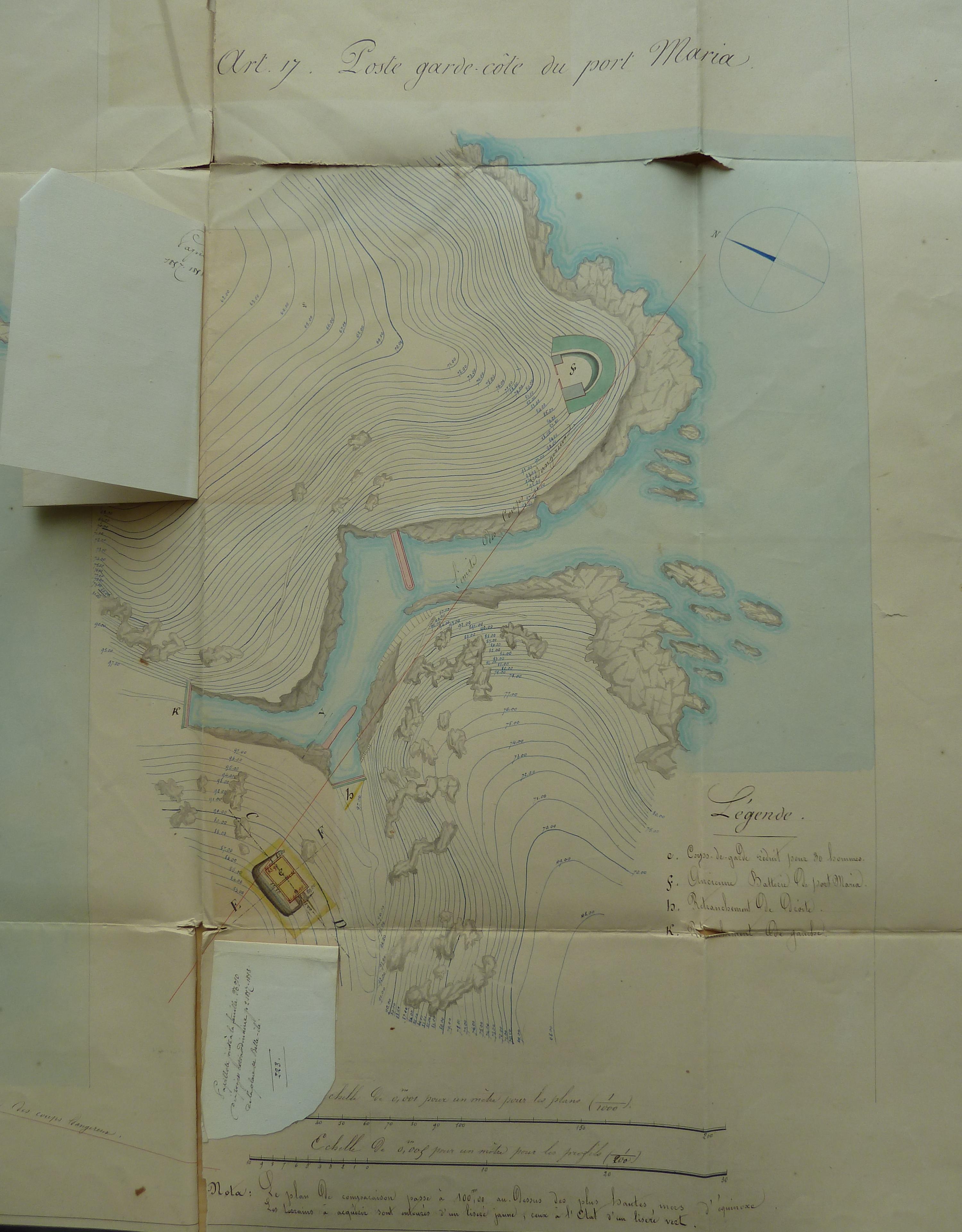 Service historique de la Défense, département Armée de Terre, Vincennes. Archives du Génie ; Article 8, Places françaises et d'Algérie : 1 VH 294, Place de Belle-Île-en-Mer, projets et dépenses annuels, 1854-1857. Direction du Génie de Brest, Place de Belle-Ile, feuille n° 10 des projets extraordinaires pour 1857-1858, batteries d'Arzic, postes garde-côtes de Port Maria et Port Andro, 19 février 1857 [papillote de correction du 18 mars 1857].