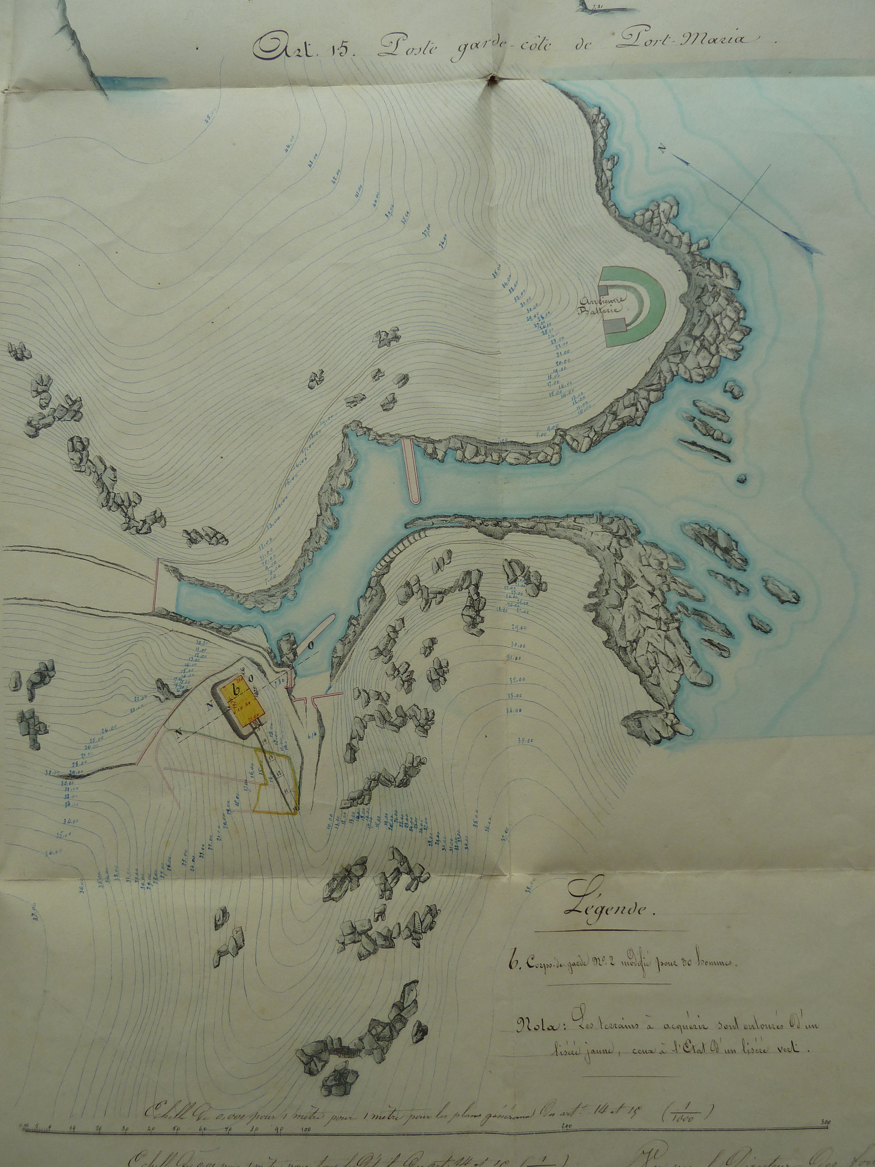 Service historique de la Défense, département Armée de Terre, Vincennes. Archives du Génie ; Article 8, Places françaises et d'Algérie : 1 VH 296, Place de Belle-Île-en-Mer, projets et dépenses annuels, 1860-1861. Direction du Génie de Brest, Place de Belle-Ile, feuille n° 1 des projets pour 1860-1861, 20 novembre 1859.