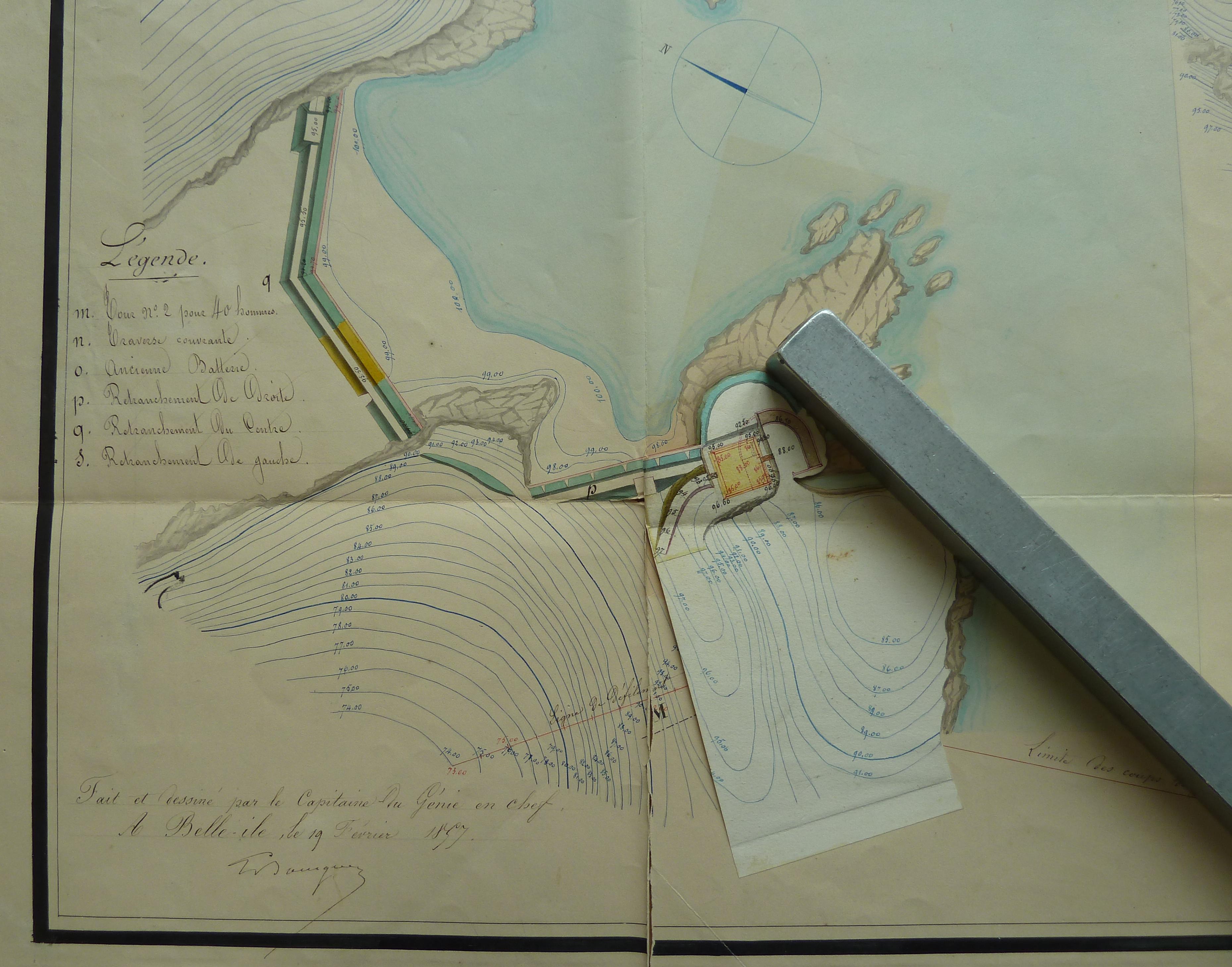 Service historique de la Défense, département Armée de Terre, Vincennes. Archives du Génie ; Article 8, Places françaises et d'Algérie : 1 VH 294, Place de Belle-Île-en-Mer, projets et dépenses annuels, 1854-1857. Direction du Génie de Brest, Place de Belle-Ile, feuille n° 10 des projets extraordinaires pour 1857-1858, batteries d'Arzic, postes garde-côtes de Port Maria et Port Andro, 19 février 1857 [papillote de correction du 18 mars 1857].