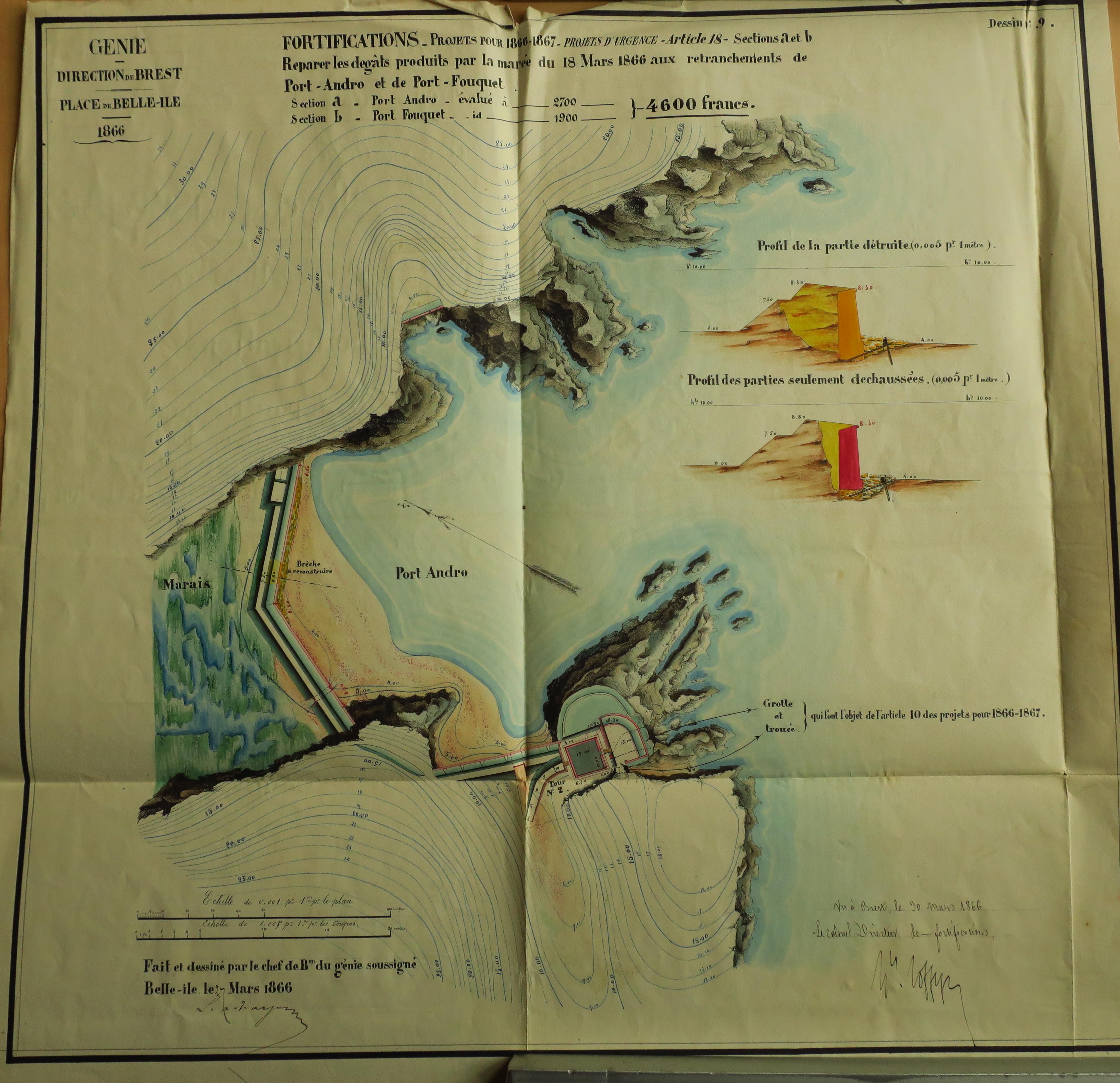 Service historique de la Défense, département Armée de Terre, Vincennes. Archives du Génie ; Article 8, Places françaises et d'Algérie : 1 VH 297, Place de Belle-Île-en-Mer, projets et dépenses annuels, 1862-1875. Direction du Génie de Brest, Place de Belle-Ile, feuille n° 9 des projets pour 1866-1867, réparer les dégâts produits par la marée du 18 mars 1866, 27 mars 1866.