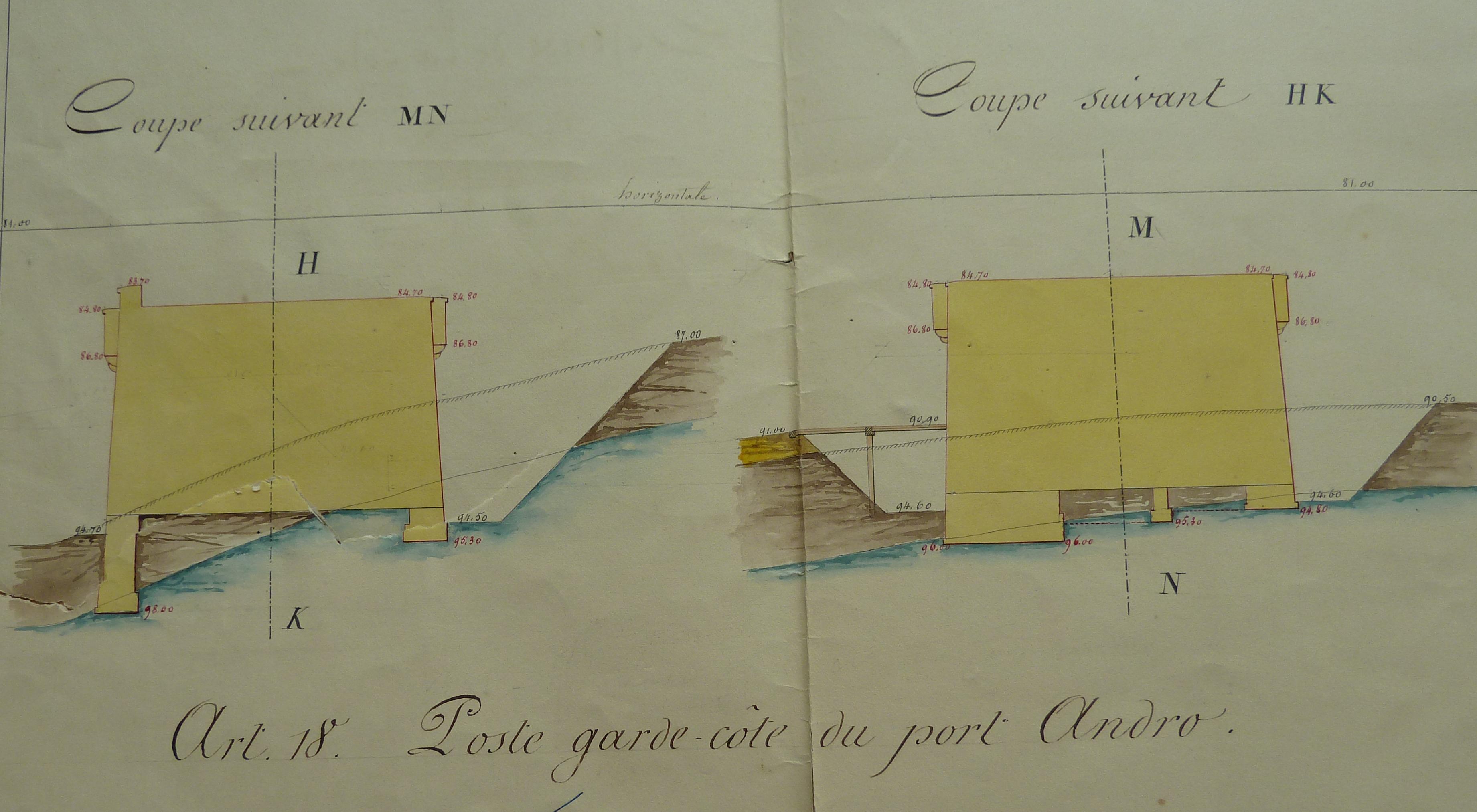 Service historique de la Défense, département Armée de Terre, Vincennes. Archives du Génie ; Article 8, Places françaises et d'Algérie : 1 VH 294, Place de Belle-Île-en-Mer, projets et dépenses annuels, 1854-1857. Direction du Génie de Brest, Place de Belle-Ile, feuille n° 10 des projets extraordinaires pour 1857-1858, batteries d'Arzic, postes garde-côtes de Port Maria et Port Andro, 19 février 1857 [papillote de correction du 18 mars 1857].