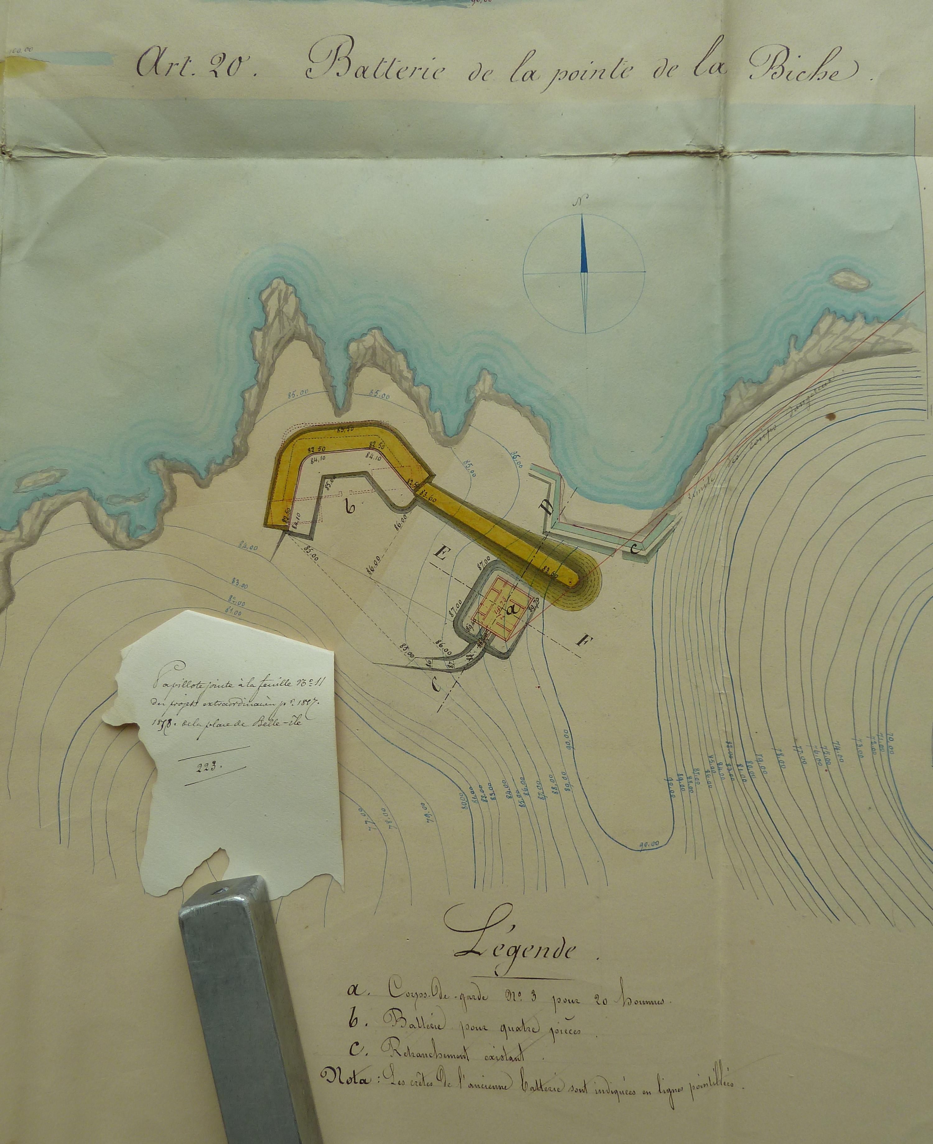 Service historique de la Défense, département Armée de Terre, Vincennes. Archives du Génie ; Article 8, Places françaises et d'Algérie : 1 VH 294, Place de Belle-Île-en-Mer, projets et dépenses annuels, 1854-1857. Direction du Génie de Brest, Place de Belle-Ile, feuille n° 11 des projets extraordinaires pour 1857-1858, batteries de Kerdonis, de La Biche et de La Ferrière, 19 février 1857 [papillote de correction du 18 mars 1857].