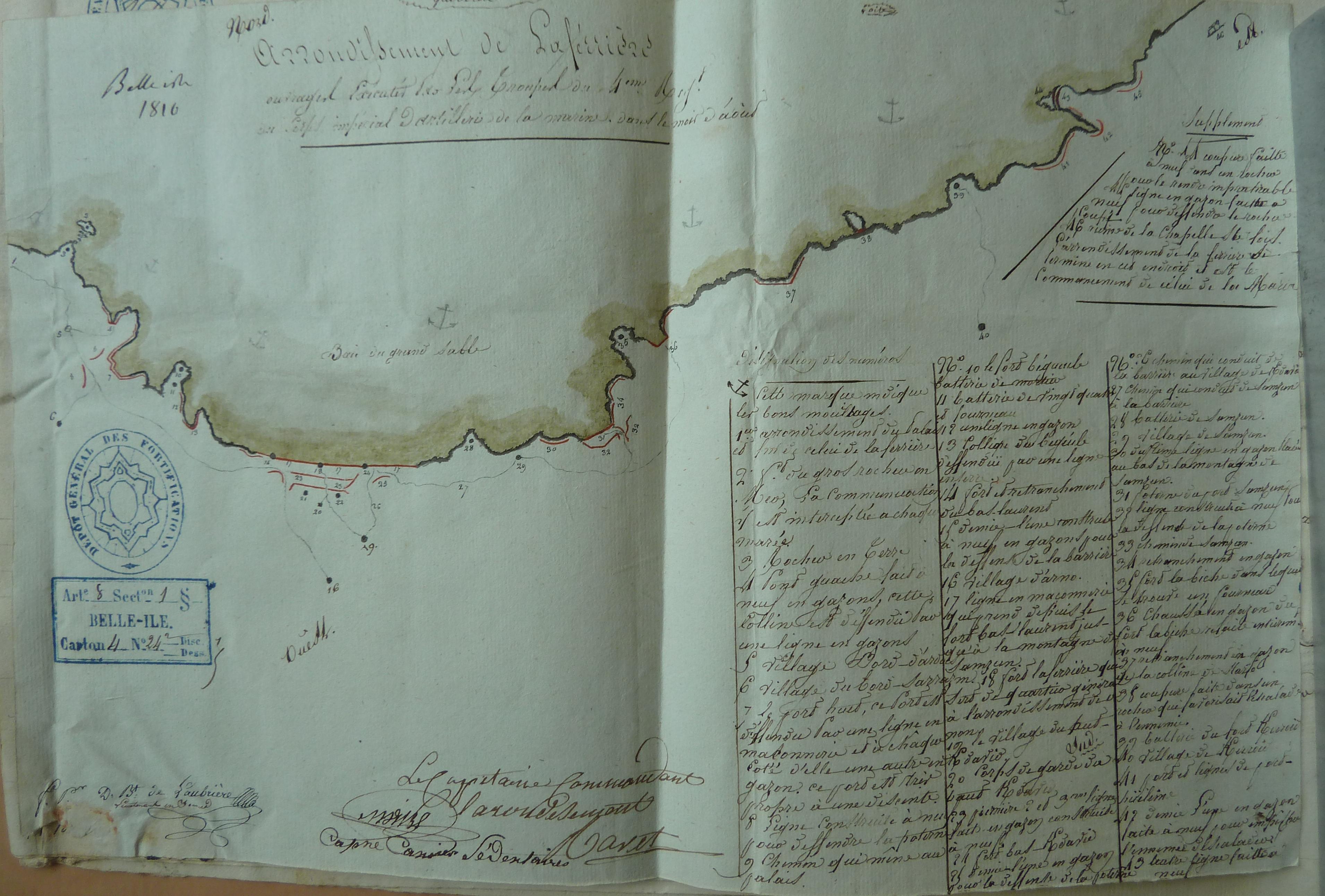Service historique de la Défense, département Armée de Terre, Vincennes. Archives du Génie ; Article 8, Places françaises et d'Algérie : 1 VH 286, Place de Belle-Île-en-Mer, projets et dépenses annuels, 1807-1816. Arrondissement de Laferrière, ouvrages exécutés par les troupes du 4ème Regt du corps impérial d'artillerie de la marine dans le mois d'août, 1810.
