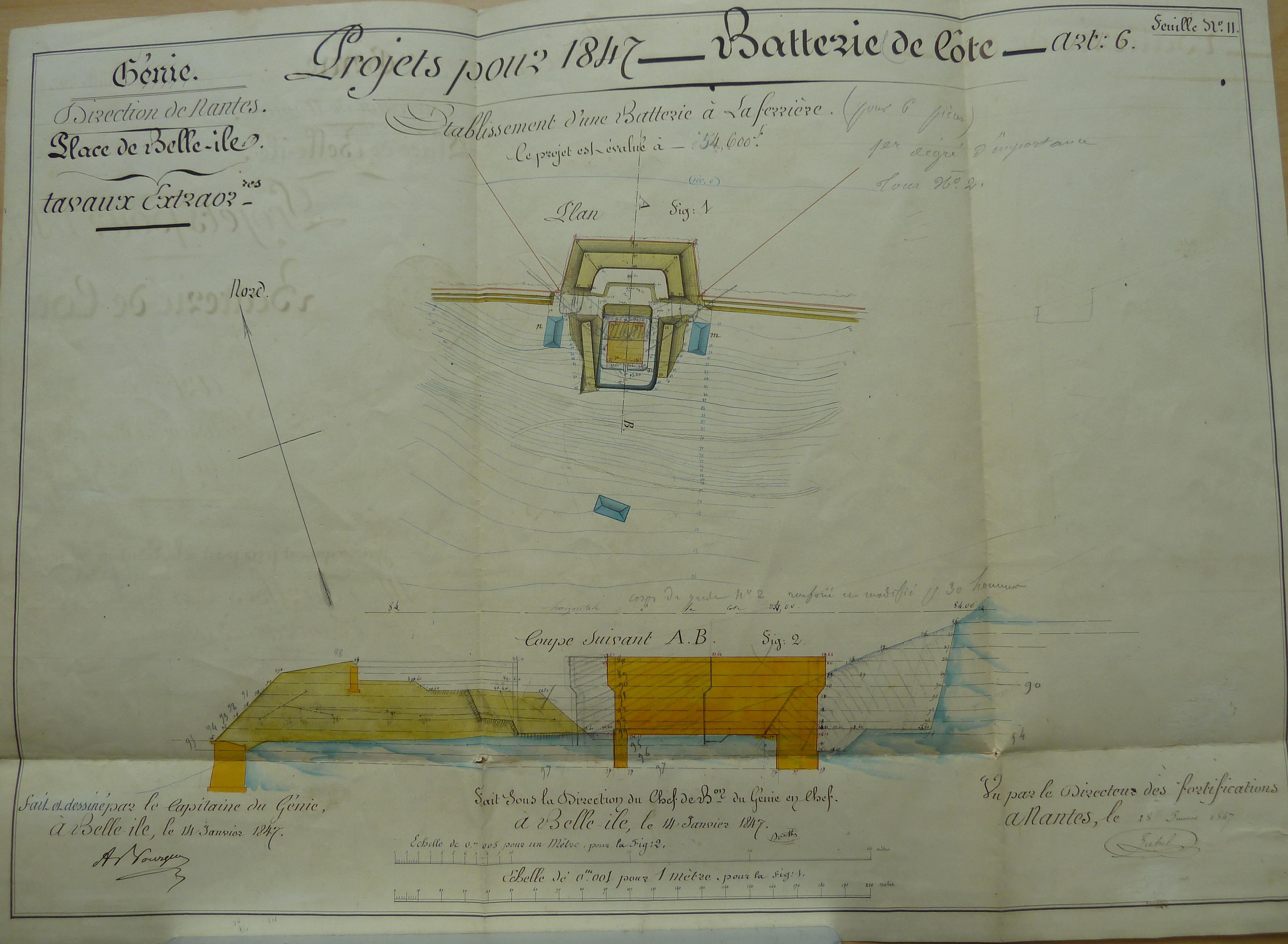Service historique de la Défense, département Armée de Terre, Vincennes. Archives du Génie ; Article 8, Places françaises et d'Algérie : 1 VH 292, Place de Belle-Île-en-Mer, projets et dépenses annuels, 1847. Direction du Génie de Nantes, Place de Belle-Ile, feuille n° 11 des projets extraordinaires pour 1847, établissement d'une batterie à La Ferrière, 14 janvier 1847.
