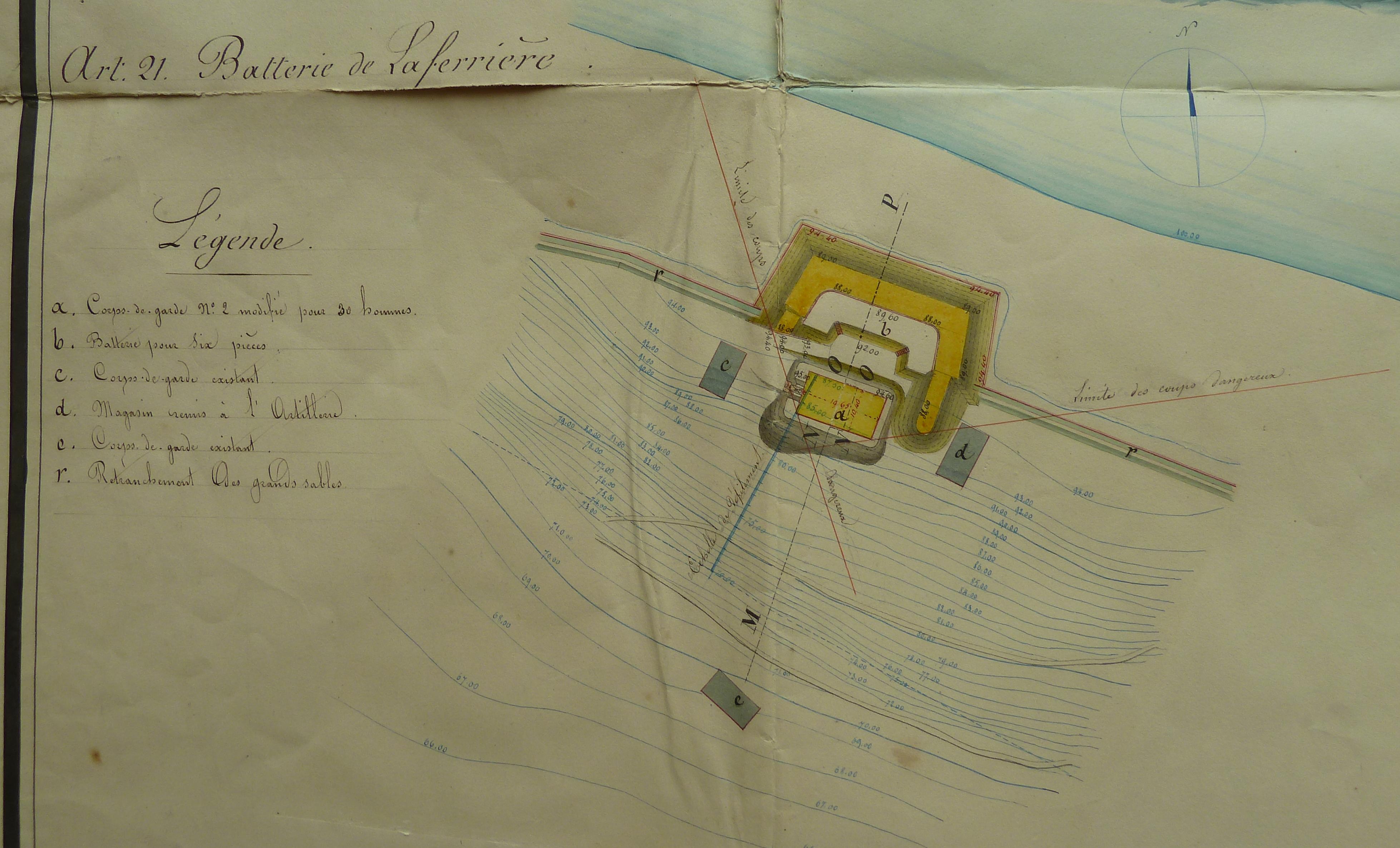 Service historique de la Défense, département Armée de Terre, Vincennes. Archives du Génie ; Article 8, Places françaises et d'Algérie : 1 VH 294, Place de Belle-Île-en-Mer, projets et dépenses annuels, 1854-1857. Direction du Génie de Brest, Place de Belle-Ile, feuille n° 11 des projets extraordinaires pour 1857-1858, batteries de Kerdonis, de La Biche et de La Ferrière, 19 février 1857 [papillote de correction du 18 mars 1857].