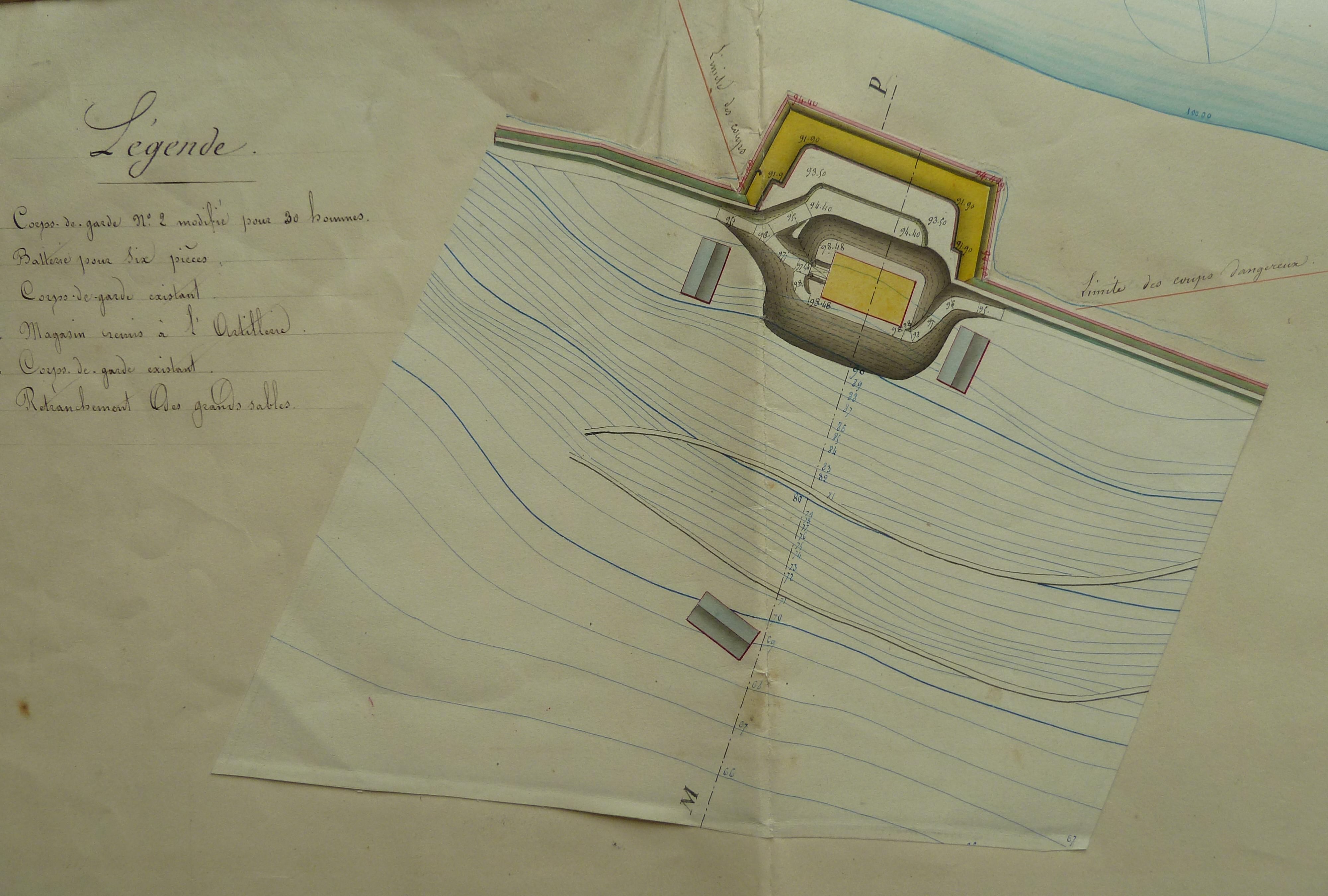 Service historique de la Défense, département Armée de Terre, Vincennes. Archives du Génie ; Article 8, Places françaises et d'Algérie : 1 VH 294, Place de Belle-Île-en-Mer, projets et dépenses annuels, 1854-1857. Direction du Génie de Brest, Place de Belle-Ile, feuille n° 11 des projets extraordinaires pour 1857-1858, batteries de Kerdonis, de La Biche et de La Ferrière, 19 février 1857 [papillote de correction du 18 mars 1857].