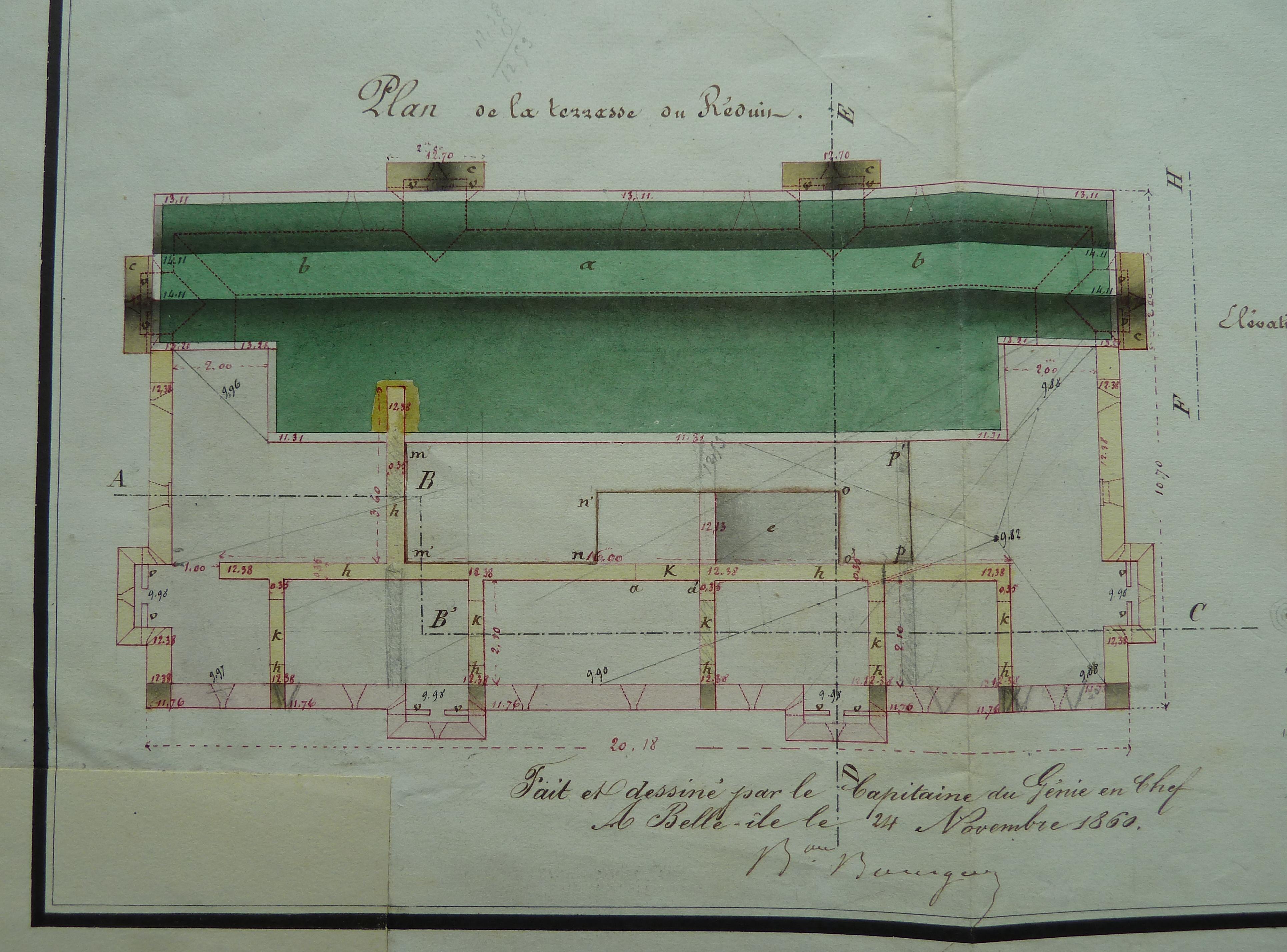 Service historique de la Défense, département Armée de Terre, Vincennes. Archives du Génie ; Article 8, Places françaises et d'Algérie : 1 VH 296, Place de Belle-Île-en-Mer, projets et dépenses annuels, 1860-1861. Direction du Génie de Brest, Place de Belle-Ile, feuille n° 13 des projets supplémentaires pour 1860-1861, batteries de La Ferrière et de La Biche, 24 novembre 1860.