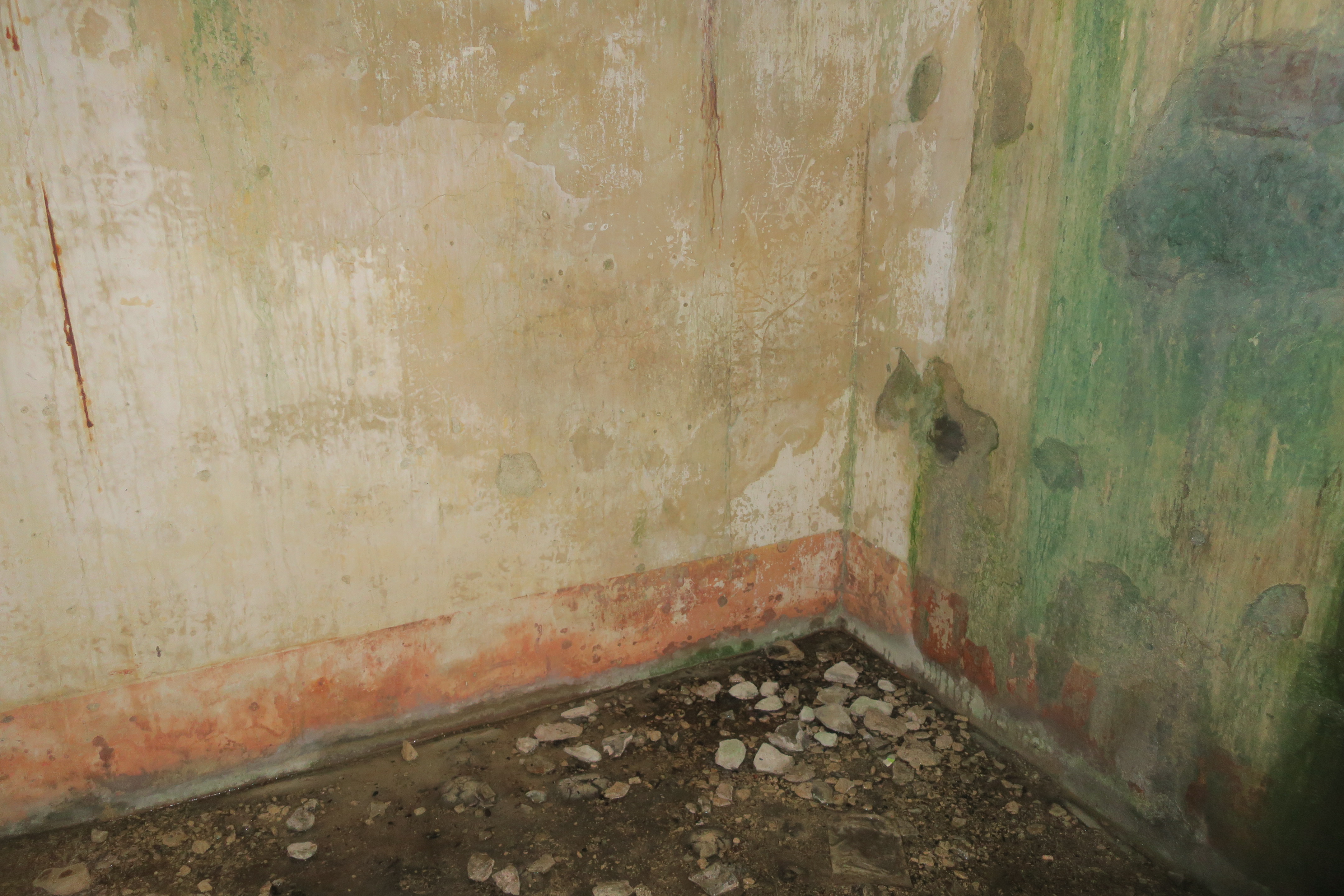 Locmaria, Grands Sables, batterie de La Ferrière, corps de garde crénelé, vestiges de peinture sur les murs.Immatriculation