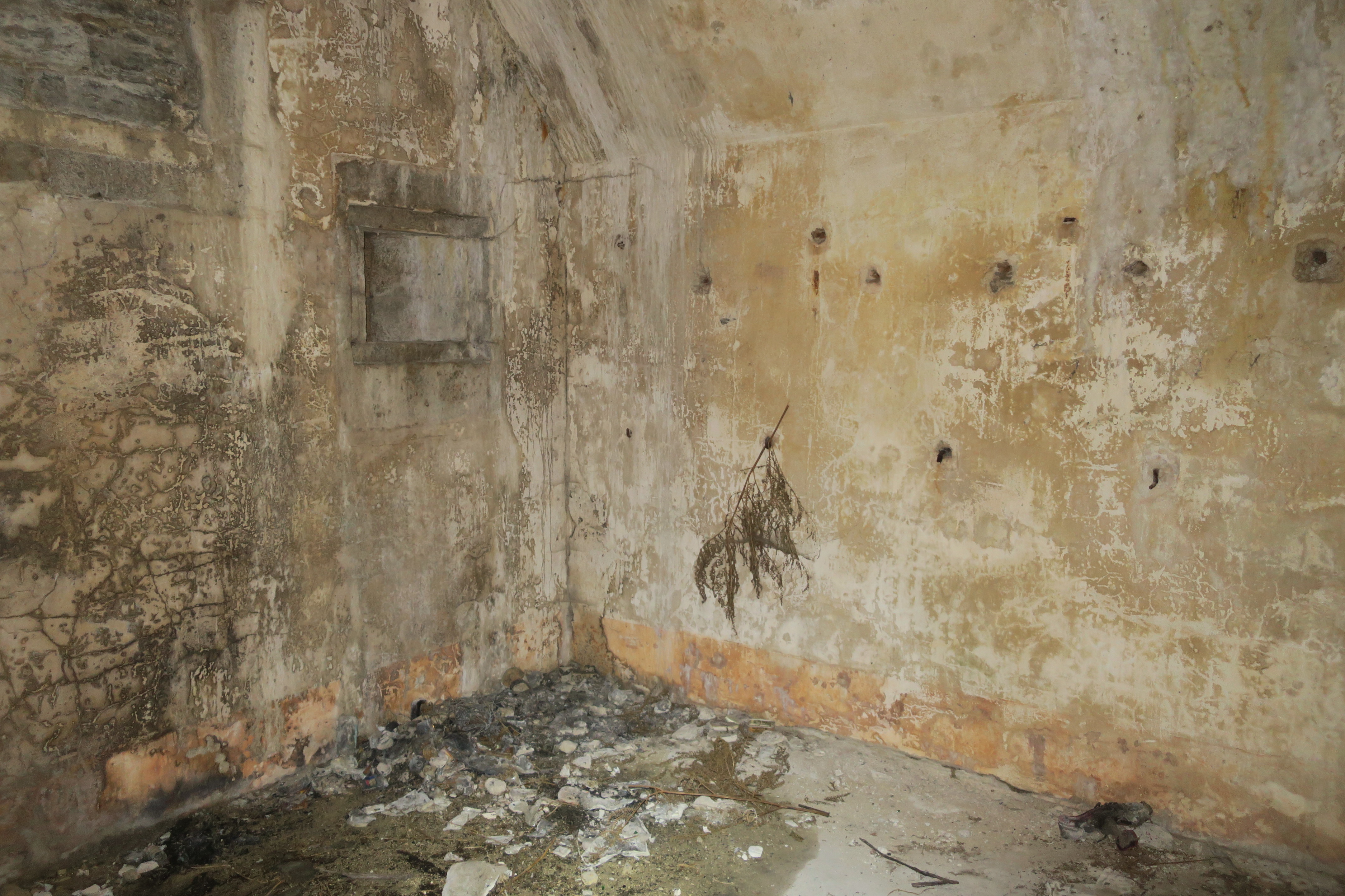 Locmaria, Grands Sables, batterie de La Ferrière, corps de garde crénelé, crochets de hamacs et pitons d'étagère à bagages.Immatriculation