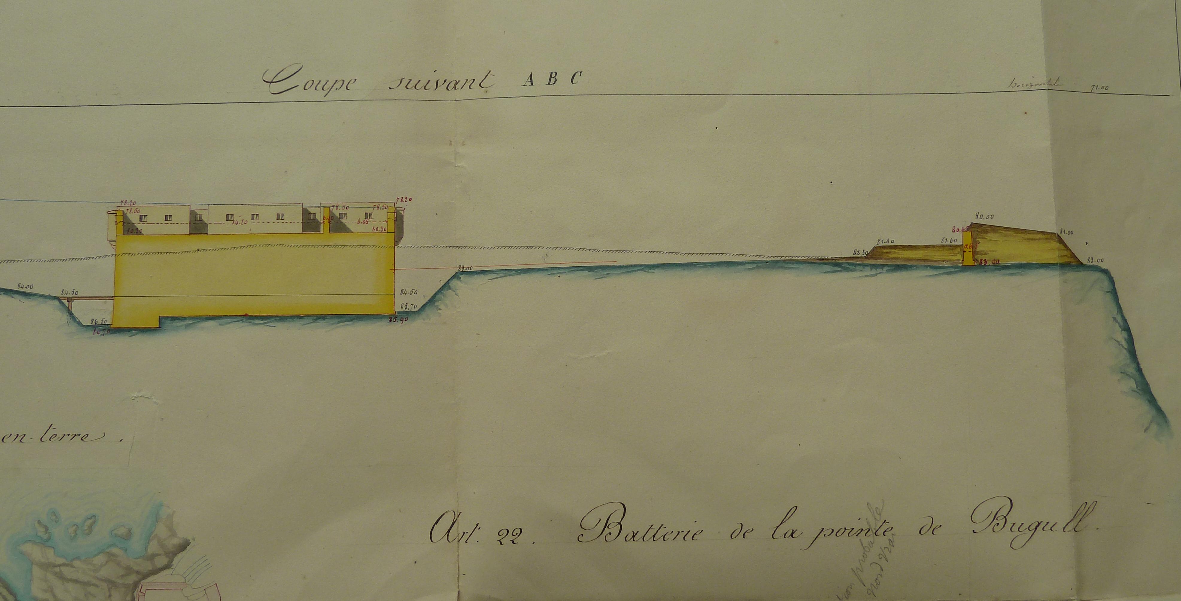 Service historique de la Défense, département Armée de Terre, Vincennes. Archives du Génie ; Article 8, Places françaises et d'Algérie : 1 VH 294, Place de Belle-Île-en-Mer, projets et dépenses annuels, 1854-1857. Direction du Génie de Brest, Place de Belle-Ile, feuille n° 12 des projets extraordinaires pour 1857, 19 février 1857 [papillote de correction du 18 mars 1857].