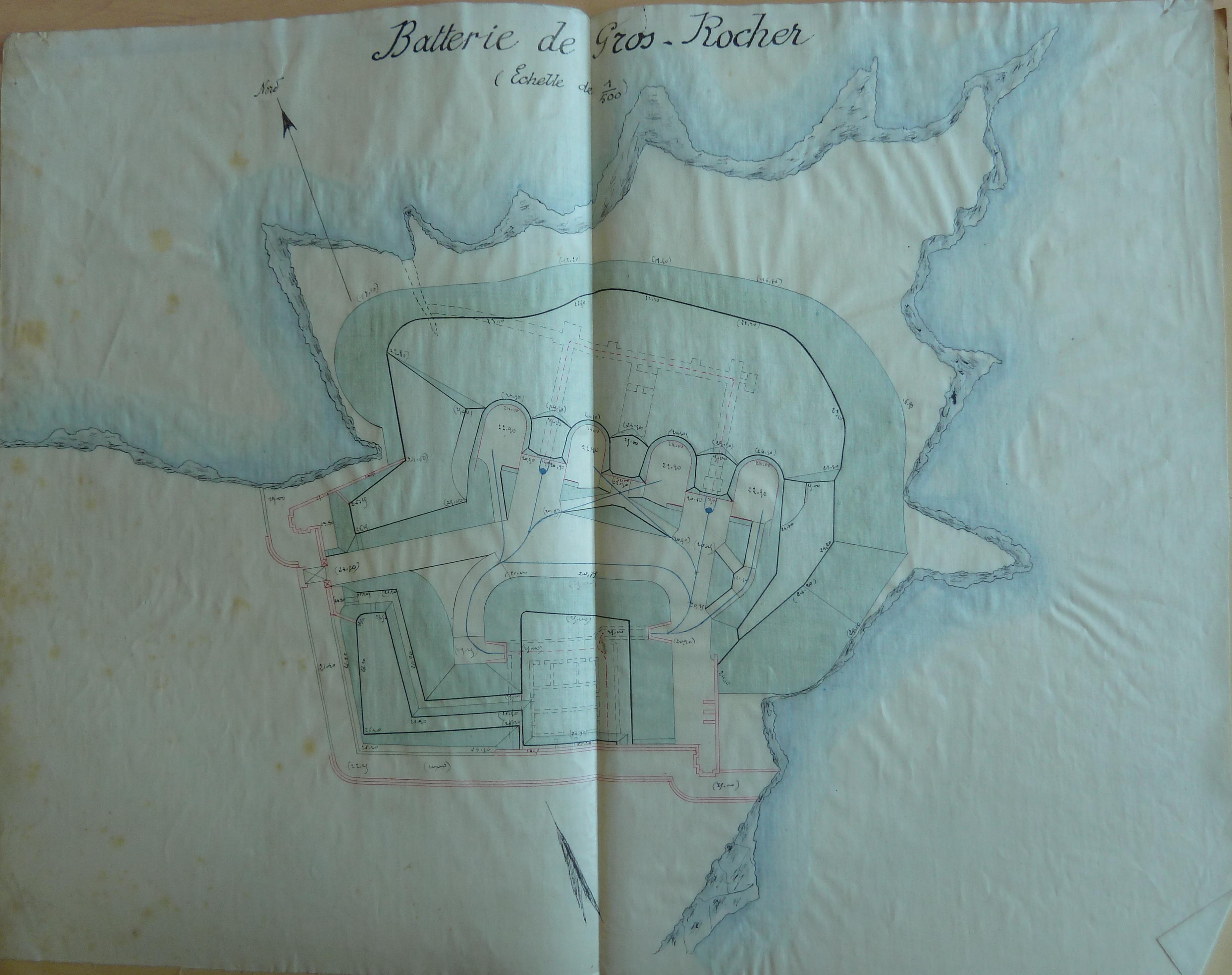 Service historique de la Défense, Département Armée de Terre, Vincennes. Archives de la Guerre, Troisième République ; Sous-série 7 N, État-major de l'Armée : 7 N 1904, Défense des fronts de mer, dossiers de l’inspection générale permanente d’armement des côtes - Atlantique : pièces collectives, Belle-Ile, Blaye, Bordeaux, Brest (1878-1912). Croquis joint au procès-verbal de conférence en date du 30 décembre 1894 relatif à l'emmagasinement des munitions dans les batteries de côte de Belle-Ile.