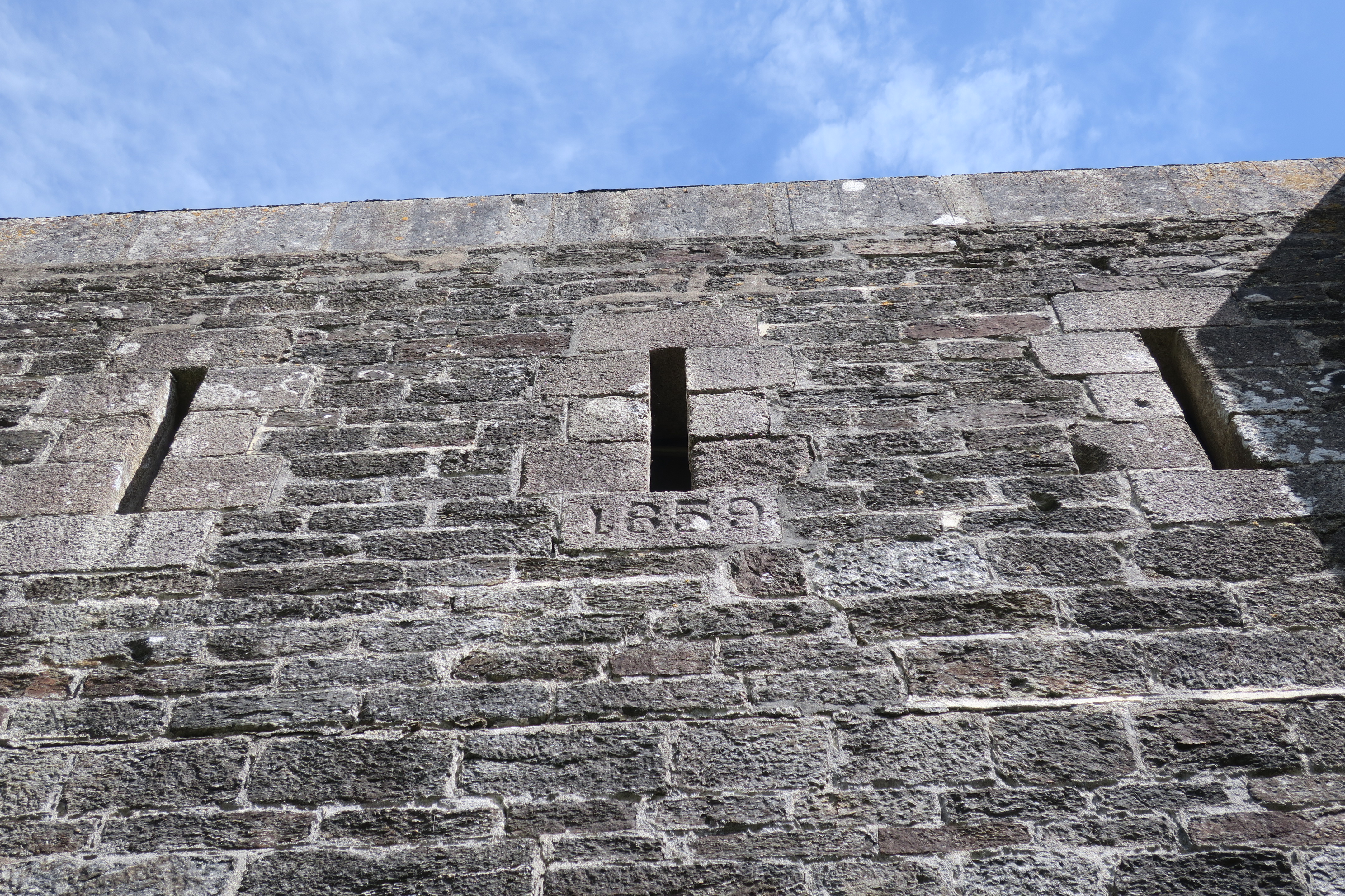 Le Palais, Port Larron, corps de garde crénelé, créneaux de tir et date inscrite sur la façade de gorge.Immatriculation