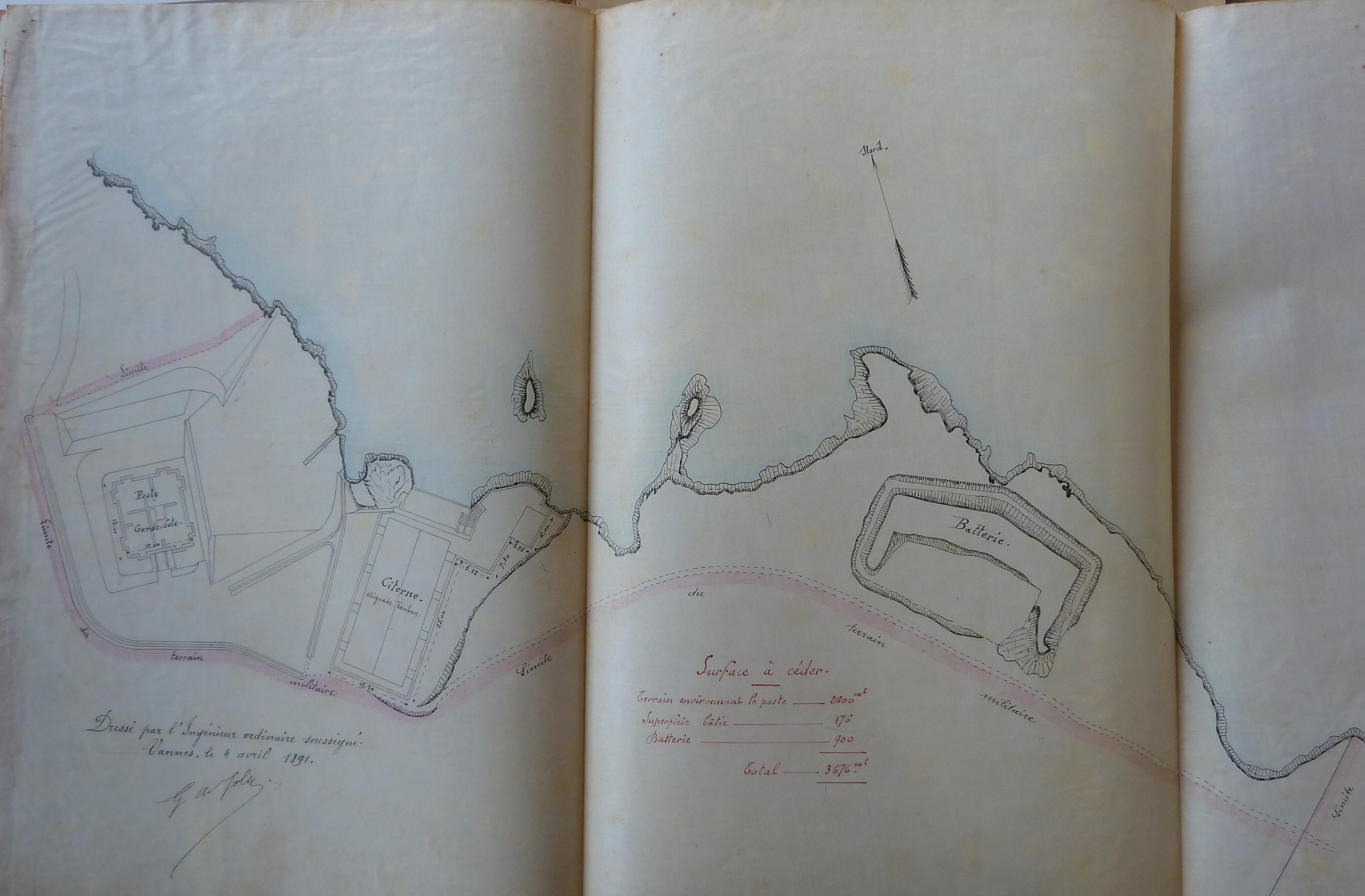 Archives départementales du Morbihan. Série Q, Domaines : Q 370 [cote provisoire], Bureau des Domaines de Belle-Île. Ponts et Chaussées, affectation au département des Travaux Publics d'ouvrages militaires déclassés, plan de la batterie de Port-Larron et de l'aiguade Vauban, 10 juin 1891.