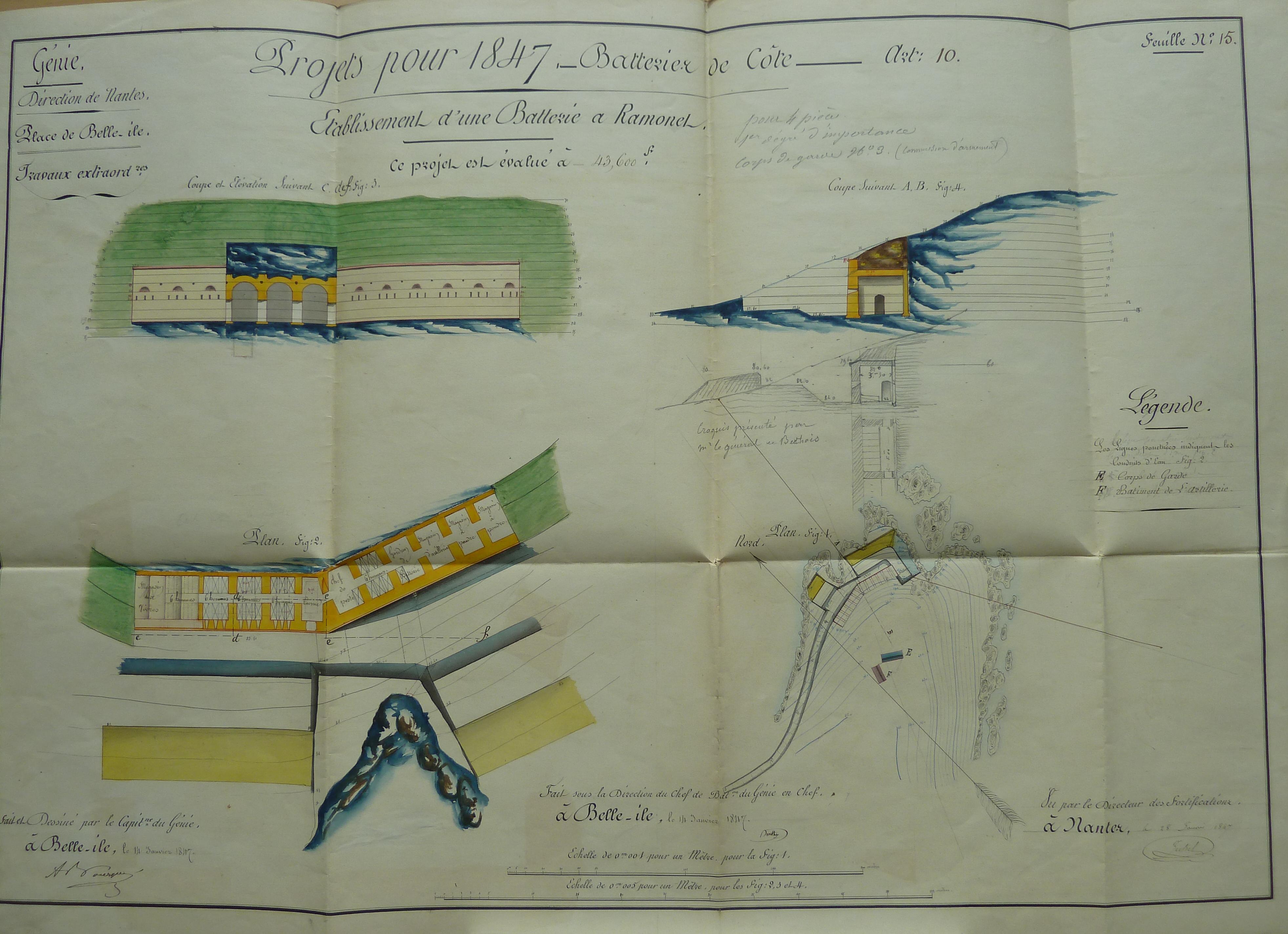 Service historique de la Défense, département Armée de Terre, Vincennes. Archives du Génie ; Article 8, Places françaises et d'Algérie : 1 VH 292, Place de Belle-Île-en-Mer, projets et dépenses annuels, 1847. Direction du Génie de Nantes, Place de Belle-Ile, feuille n° 15 des projets extraordinaires pour 1847, établissement d'une batterie à Ramonet, 14 janvier 1847.