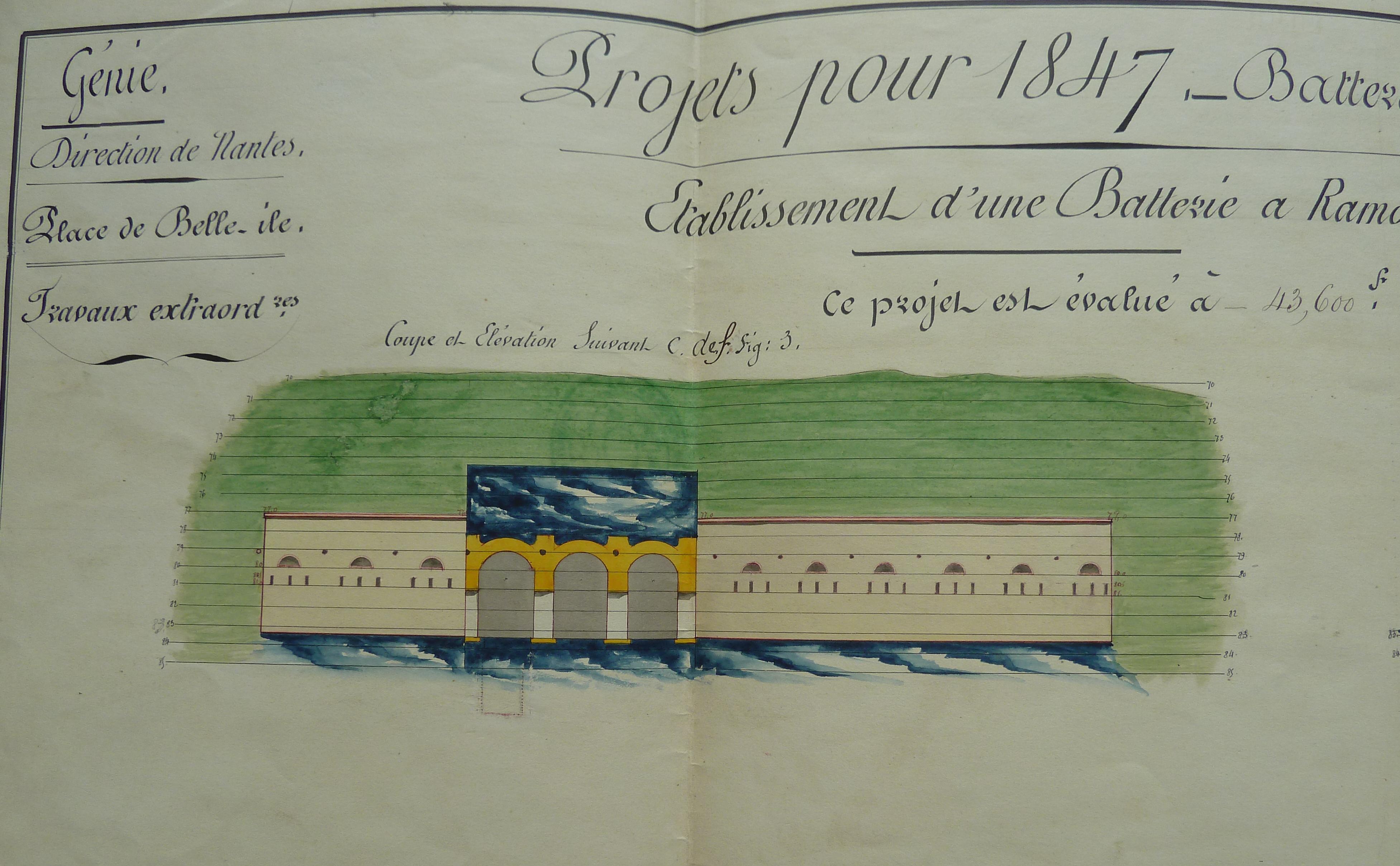 Service historique de la Défense, département Armée de Terre, Vincennes. Archives du Génie ; Article 8, Places françaises et d'Algérie : 1 VH 292, Place de Belle-Île-en-Mer, projets et dépenses annuels, 1847. Direction du Génie de Nantes, Place de Belle-Ile, feuille n° 15 des projets extraordinaires pour 1847, établissement d'une batterie à Ramonet, 14 janvier 1847.