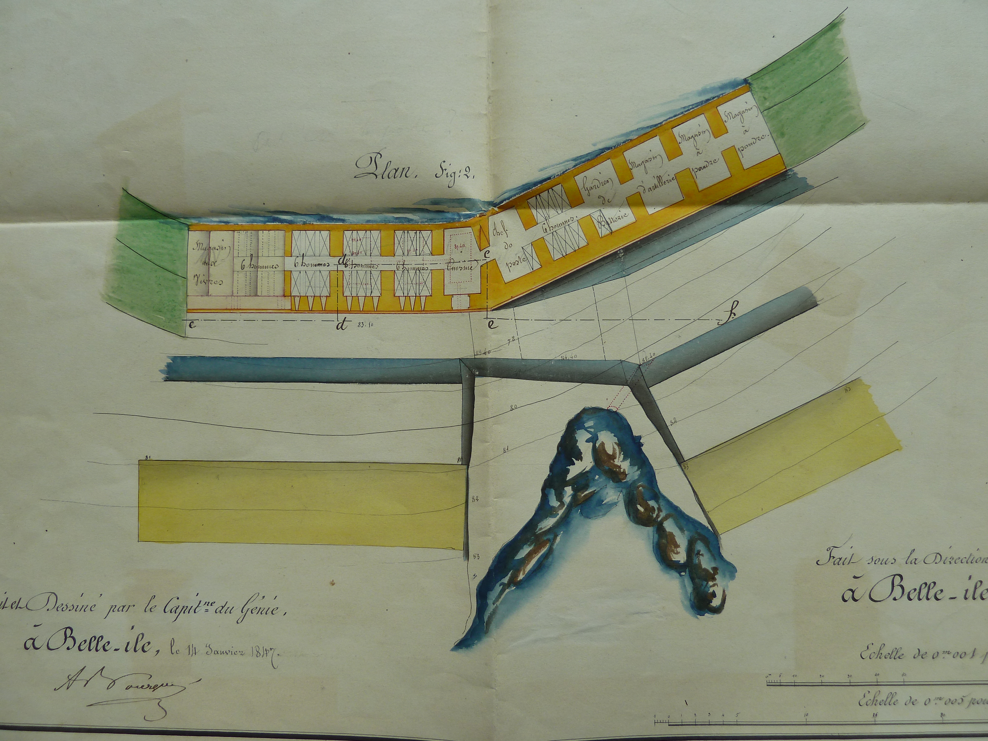 Service historique de la Défense, département Armée de Terre, Vincennes. Archives du Génie ; Article 8, Places françaises et d'Algérie : 1 VH 292, Place de Belle-Île-en-Mer, projets et dépenses annuels, 1847. Direction du Génie de Nantes, Place de Belle-Ile, feuille n° 15 des projets extraordinaires pour 1847, établissement d'une batterie à Ramonet, 14 janvier 1847.