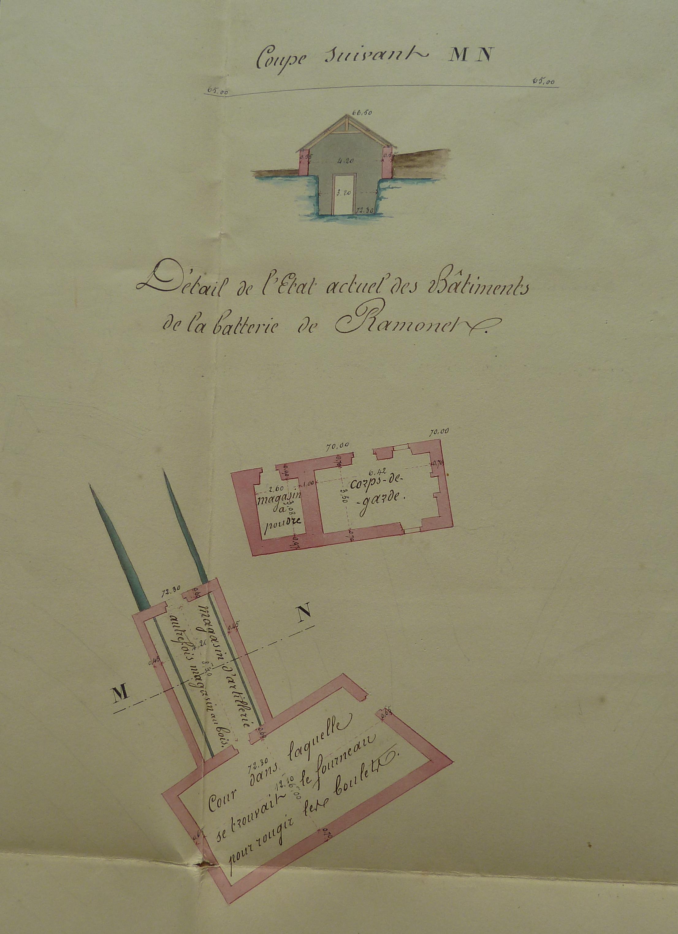 Service historique de la Défense, département Armée de Terre, Vincennes. Archives du Génie ; Article 8, Places françaises et d'Algérie : 1 VH 294, Place de Belle-Île-en-Mer, projets et dépenses annuels, 1854-1857. Direction du Génie de Brest, Place de Belle-Ile, feuille n° 13 des projets extraordinaires pour 1857-1858, batterie de la pointe de Ramonet et détails des modifications apportées aux corps-de-garde types, 19 février 1857.