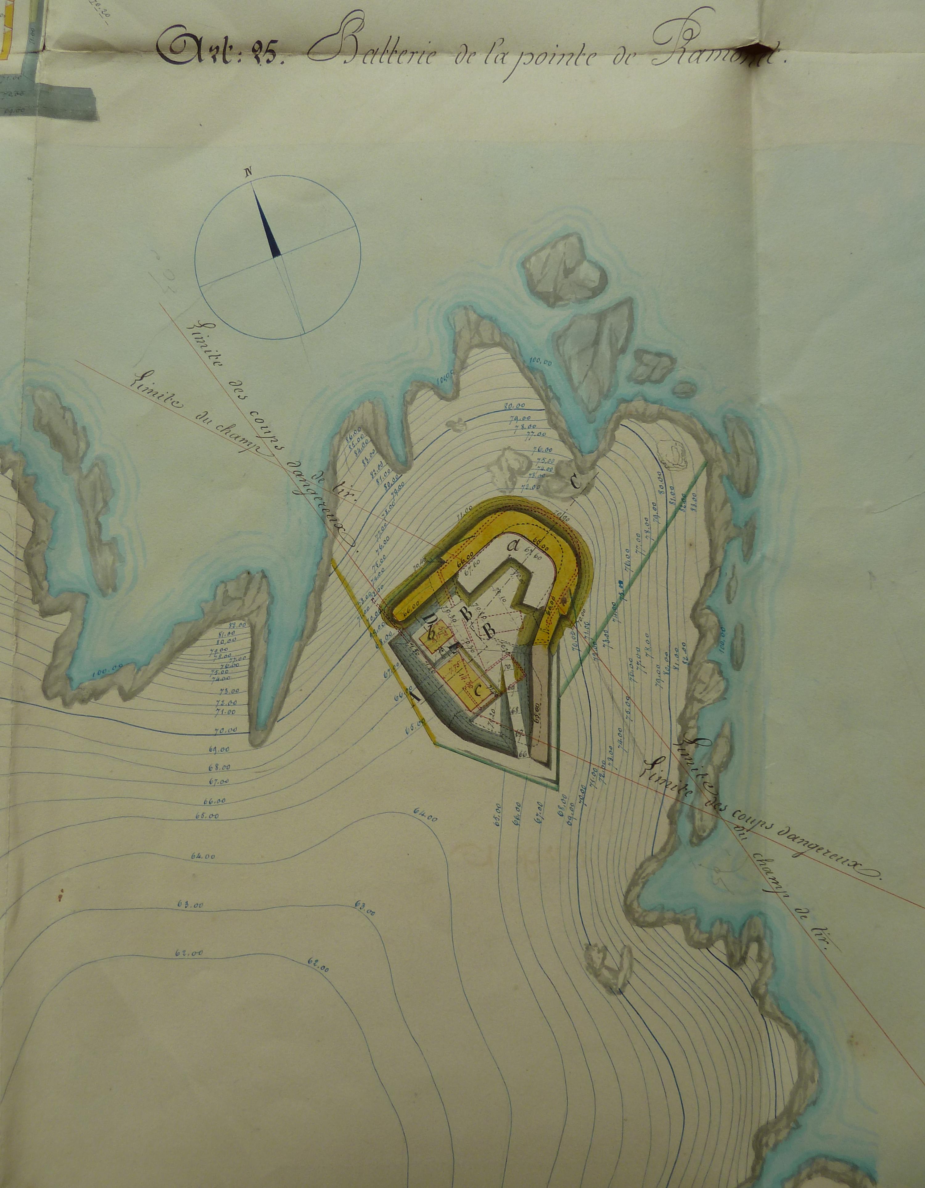 Service historique de la Défense, département Armée de Terre, Vincennes. Archives du Génie ; Article 8, Places françaises et d'Algérie : 1 VH 294, Place de Belle-Île-en-Mer, projets et dépenses annuels, 1854-1857. Direction du Génie de Brest, Place de Belle-Ile, feuille n° 13 des projets extraordinaires pour 1857-1858, batterie de la pointe de Ramonet et détails des modifications apportées aux corps-de-garde types, 19 février 1857.