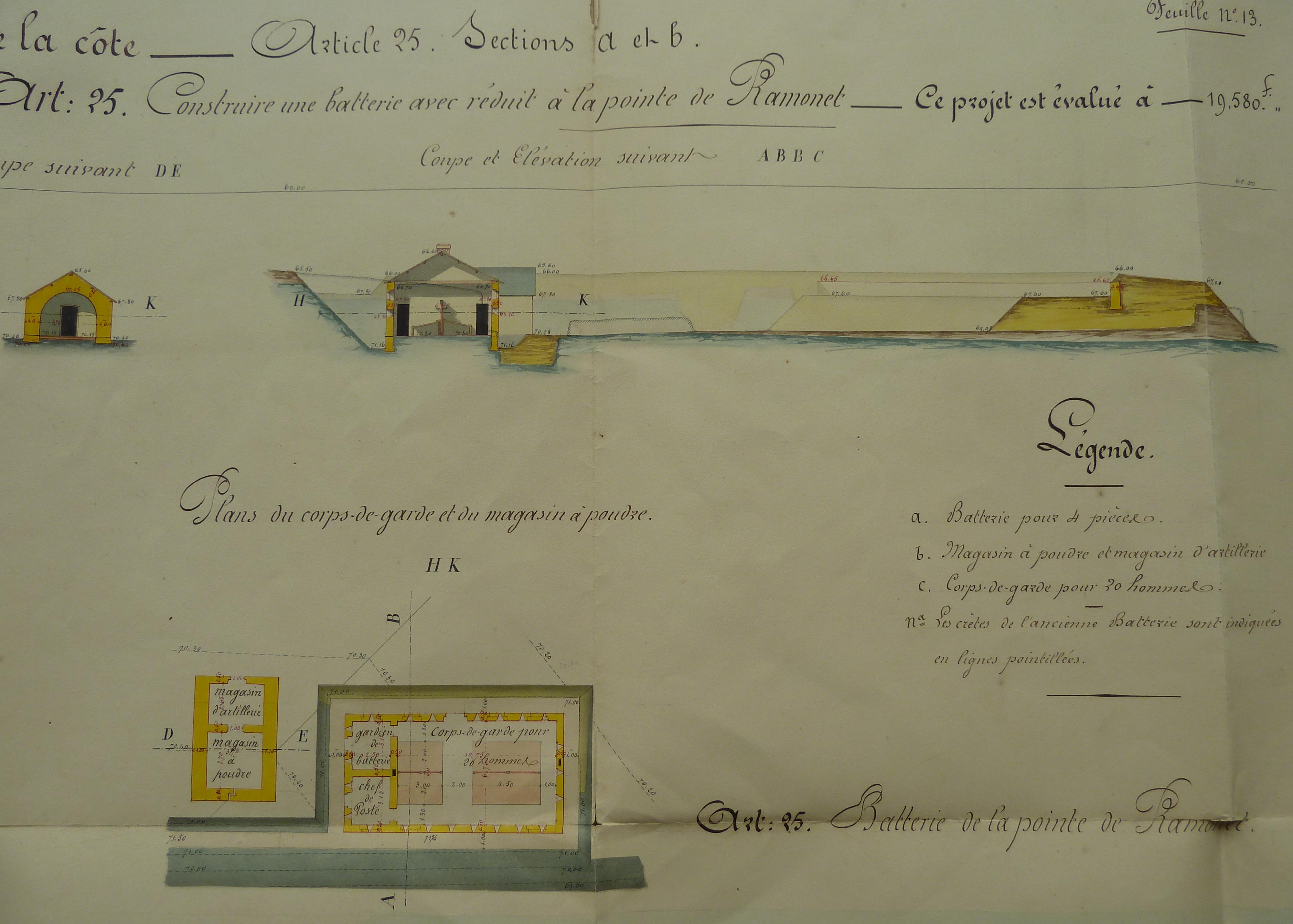 Service historique de la Défense, département Armée de Terre, Vincennes. Archives du Génie ; Article 8, Places françaises et d'Algérie : 1 VH 294, Place de Belle-Île-en-Mer, projets et dépenses annuels, 1854-1857. Direction du Génie de Brest, Place de Belle-Ile, feuille n° 13 des projets extraordinaires pour 1857-1858, batterie de la pointe de Ramonet et détails des modifications apportées aux corps-de-garde types, 19 février 1857.