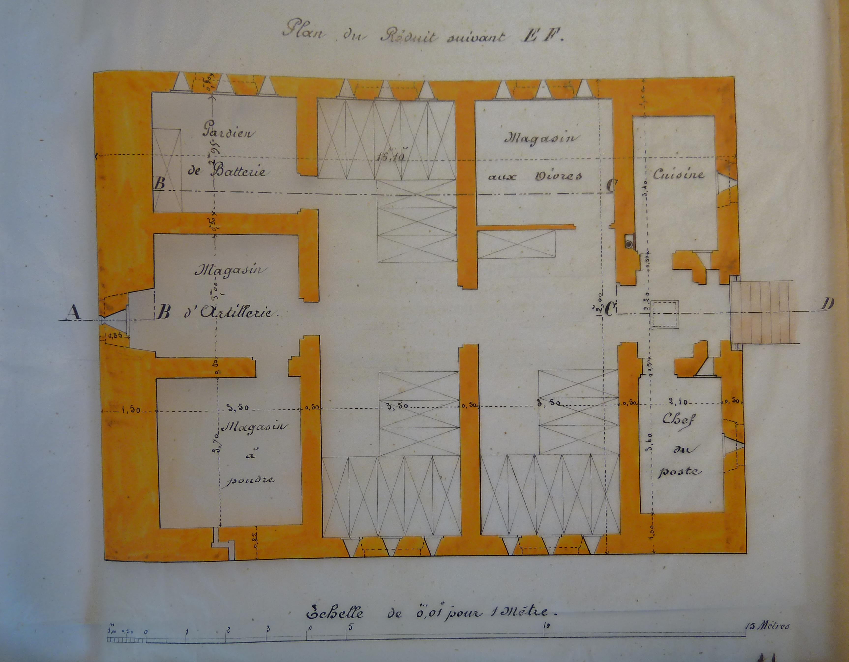 Service historique de la Défense, département Armée de Terre, Vincennes. Archives du Génie ; Article 12, Avis du Comité : 1 VK 534, Croquis annexés aux avis du Comité, Bellegarde, Belle-Île-en-Mer, Bergues (1818-1885). Croquis n° 1 annexé à l'avis du Comité en date du 16 avril 1861, construire le réduit de la batterie de Ramonet.