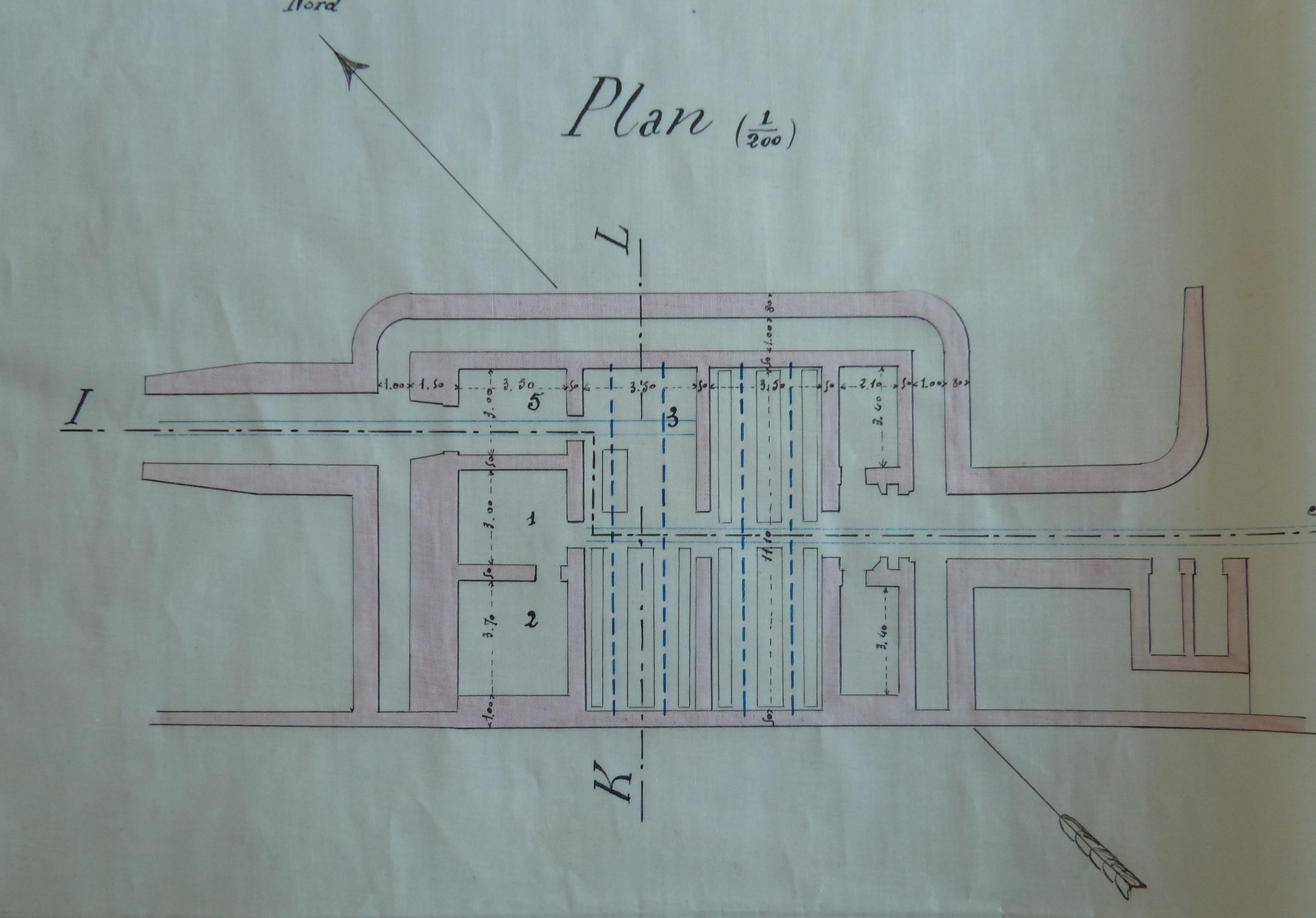 Service historique de la Défense, Département Armée de Terre, Vincennes. Archives de la Guerre, Troisième République ; Sous-série 7 N, État-major de l'Armée : 7 N 1904, Défense des fronts de mer, dossiers de l’inspection générale permanente d’armement des côtes - Atlantique : pièces collectives, Belle-Ile, Blaye, Bordeaux, Brest (1878-1912). Croquis joint au procès-verbal de conférence en date du 30 décembre 1894 relatif à l'emmagasinement des munitions dans les batteries de côte de Belle-Ile.