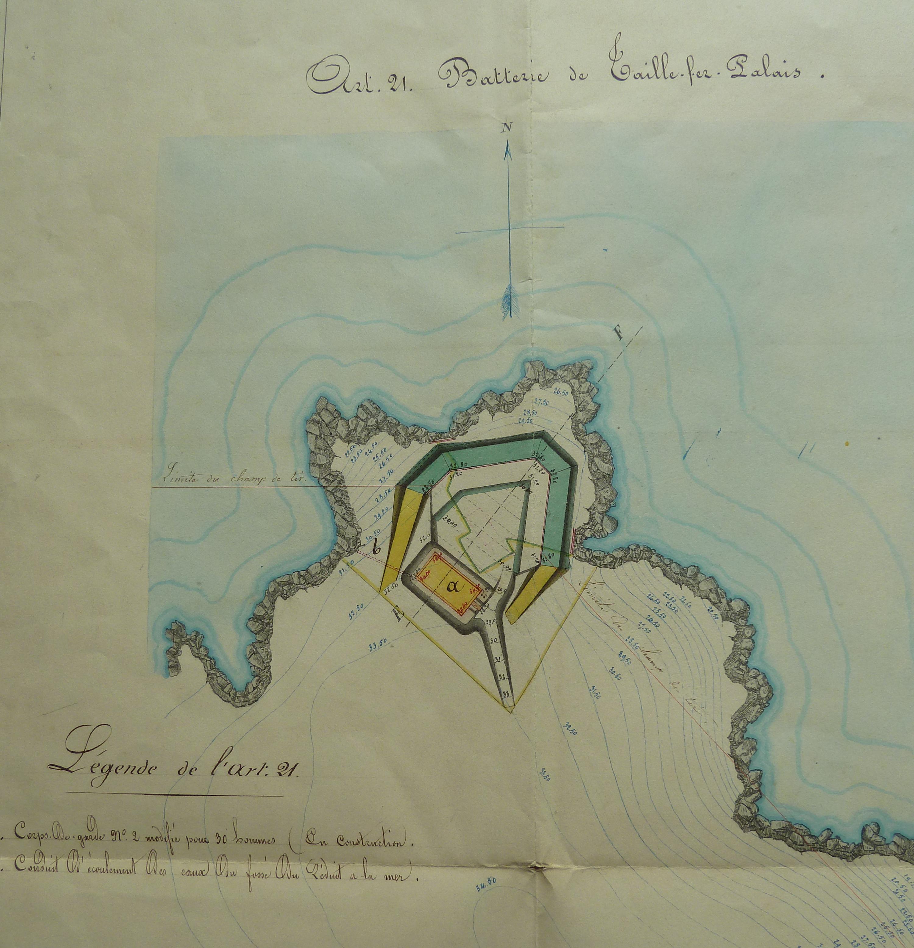Service historique de la Défense, département Armée de Terre, Vincennes. Archives du Génie ; Article 8, Places françaises et d'Algérie : 1 VH 296, Place de Belle-Île-en-Mer, projets et dépenses annuels, 1860-1861. Direction du Génie de Brest, Place de Belle-Ile, feuille n° 12 des projets pour 1860-1861, poste garde-côte du Port Larron, batteries de Ramonet et de Taillefer, 20 novembre 1859.