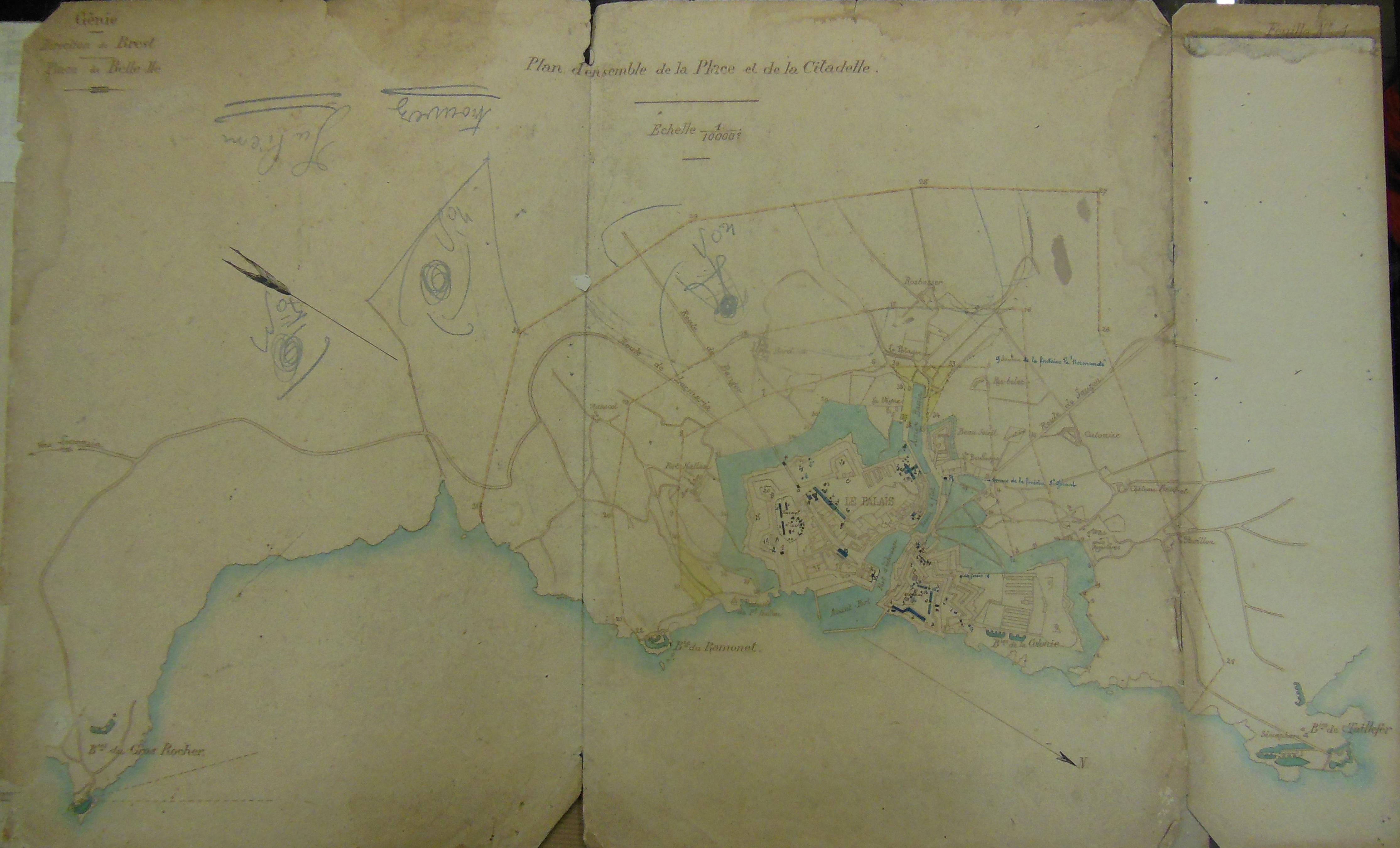 Service historique de la Défense, Département Marine, Lorient. Archives de la Place et du Génie de Belle-Île-en-Mer ; Sous-série 4 S2, archives du Génie de Belle-Île-en-Mer : 4 S2 22, Direction du Génie de Brest, Place de Belle-Ile, plan d'ensemble de la place et de la citadelle, sans date [fin 19e siècle].