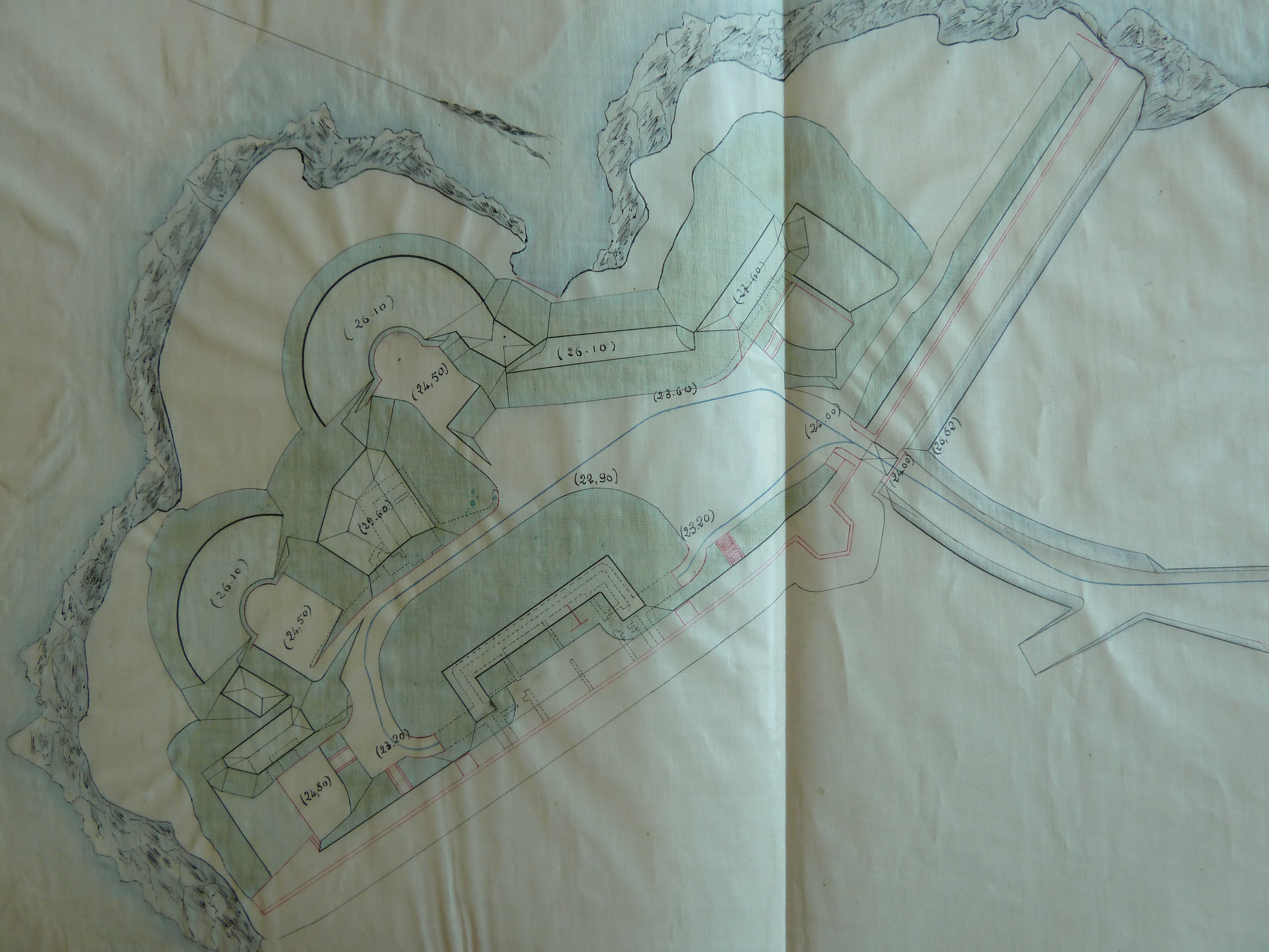 Service historique de la Défense, Département Armée de Terre, Vincennes. Archives de la Guerre, Troisième République ; Sous-série 7 N, État-major de l'Armée : 7 N 1904, Défense des fronts de mer, dossiers de l’inspection générale permanente d’armement des côtes - Atlantique : pièces collectives, Belle-Ile, Blaye, Bordeaux, Brest (1878-1912). Croquis joint au procès-verbal de conférence en date du 30 décembre 1894 relatif à l'emmagasinement des munitions dans les batteries de côte de Belle-Ile.