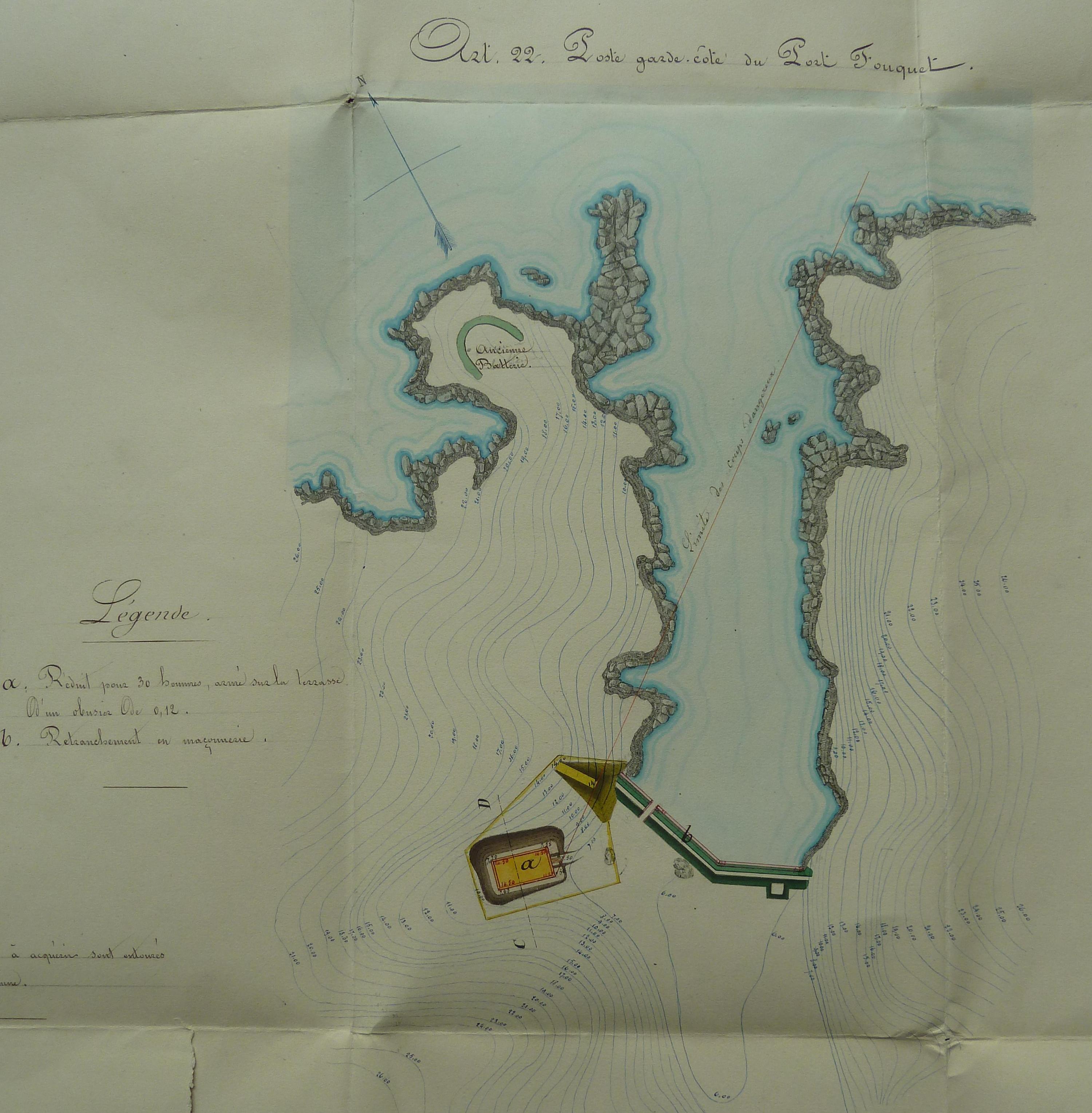 Service historique de la Défense, département Armée de Terre, Vincennes. Archives du Génie ; Article 8, Places françaises et d'Algérie : 1 VH 292, Place de Belle-Île-en-Mer, projets et dépenses annuels, 1847. Direction du Génie de Brest, Place de Belle-Ile, feuille n° 3 des projets extraordinaires pour 1860-1861, postes garde-côtes du Port Fouquet et de la pointe aux Poulains, 20 novembre 1859.