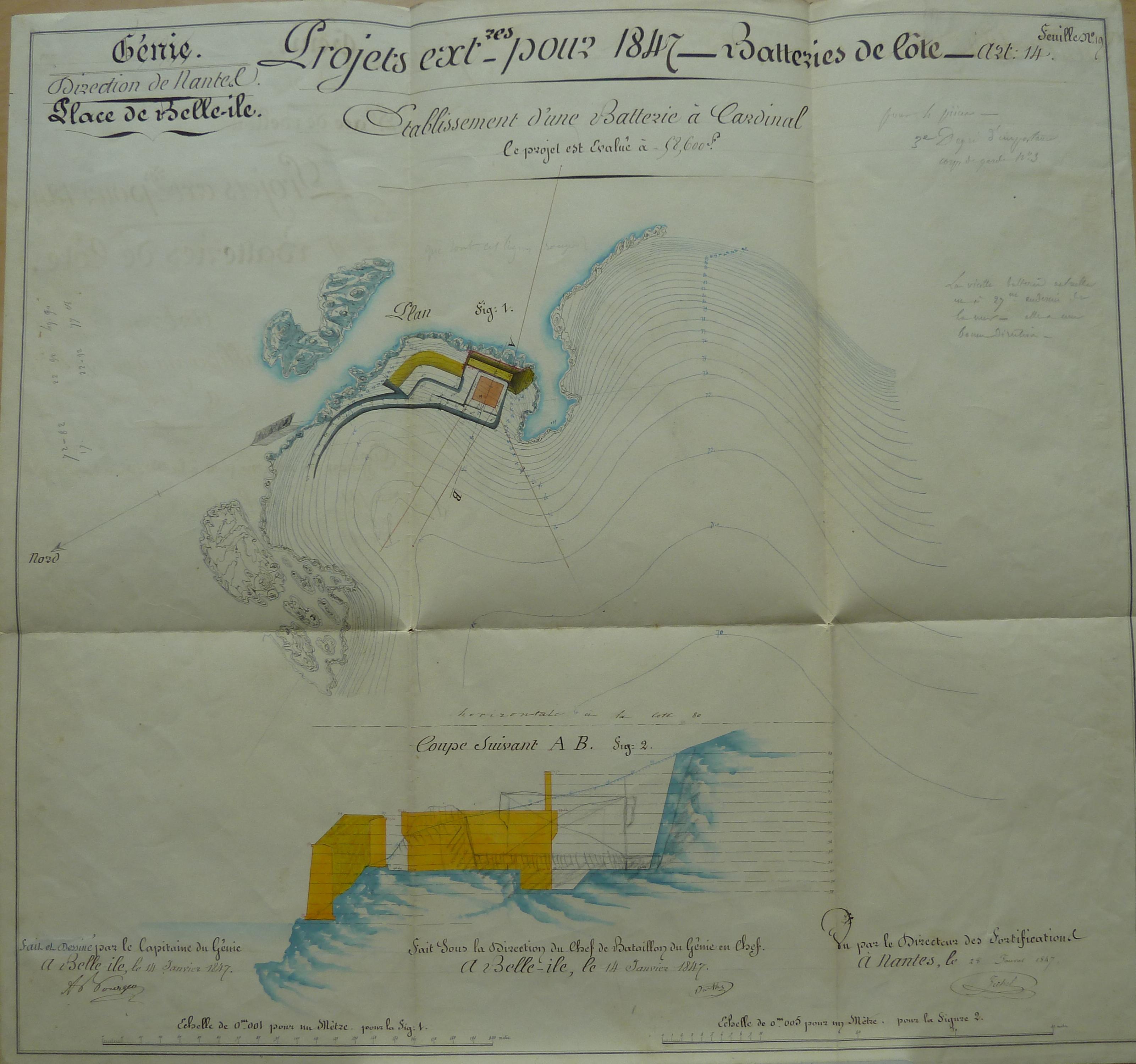Service historique de la Défense, département Armée de Terre, Vincennes. Archives du Génie ; Article 8, Places françaises et d'Algérie : 1 VH 292, Place de Belle-Île-en-Mer, projets et dépenses annuels, 1847. Direction du Génie de Nantes, Place de Belle-Ile, feuille n° 19 des projets extraordinaires pour 1847, établissement d'une batterie à Cardinal, 14 janvier 1847.