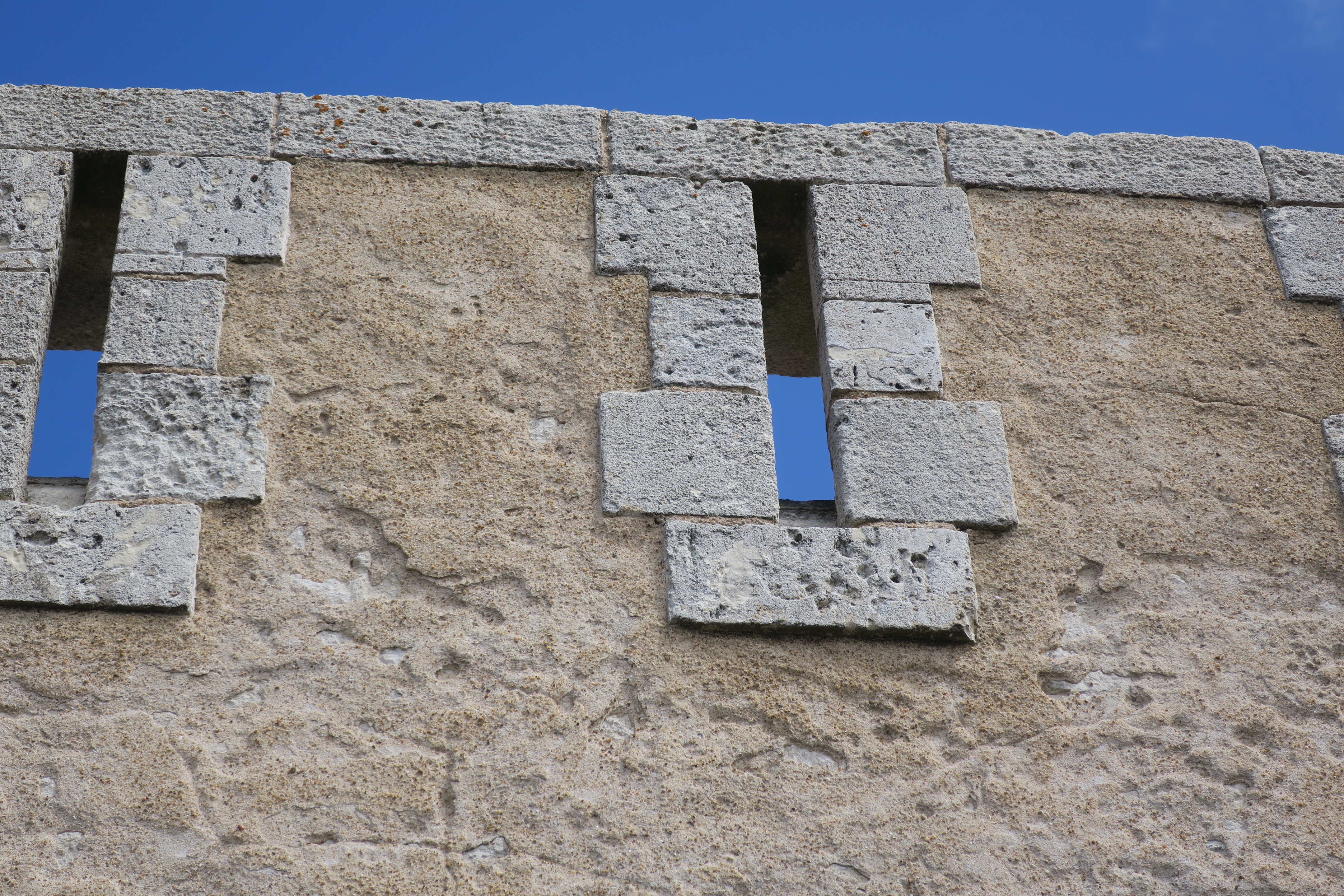 Sauzon, pointe des Poulains, corps de garde crénelé dit Fort Sarah Bernhardt, créneaux de tir et date "1861" partiellement effacée.Immatriculation