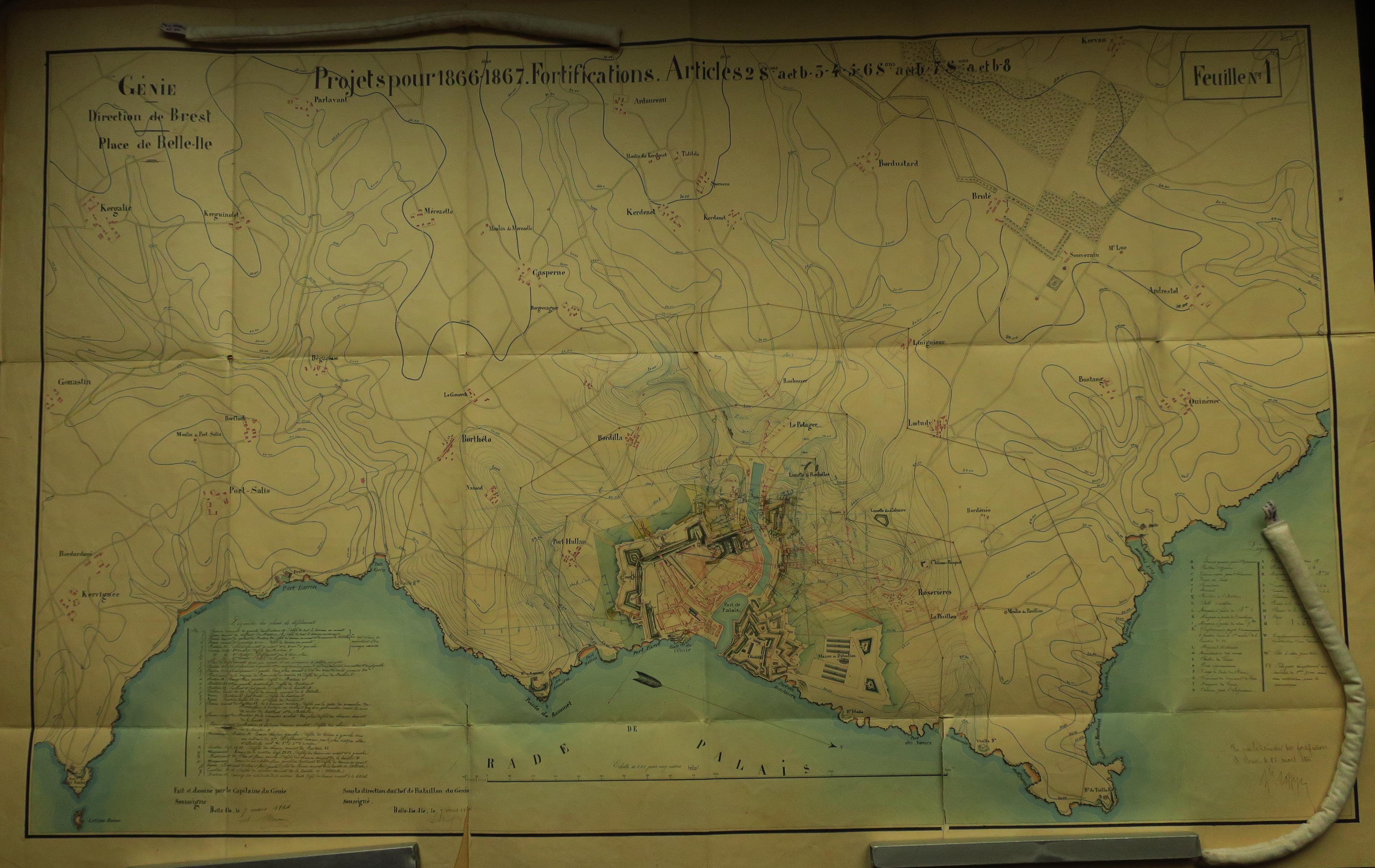 Service historique de la Défense, département Armée de Terre, Vincennes. Archives du Génie ; Article 8, Places françaises et d'Algérie : 1 VH 297, Place de Belle-Île-en-Mer, projets et dépenses annuels, 1862-1875. Direction du Génie de Brest, Place de Belle-Ile, feuille n° 1 des projets pour 1866-1867, 7 mars 1866.