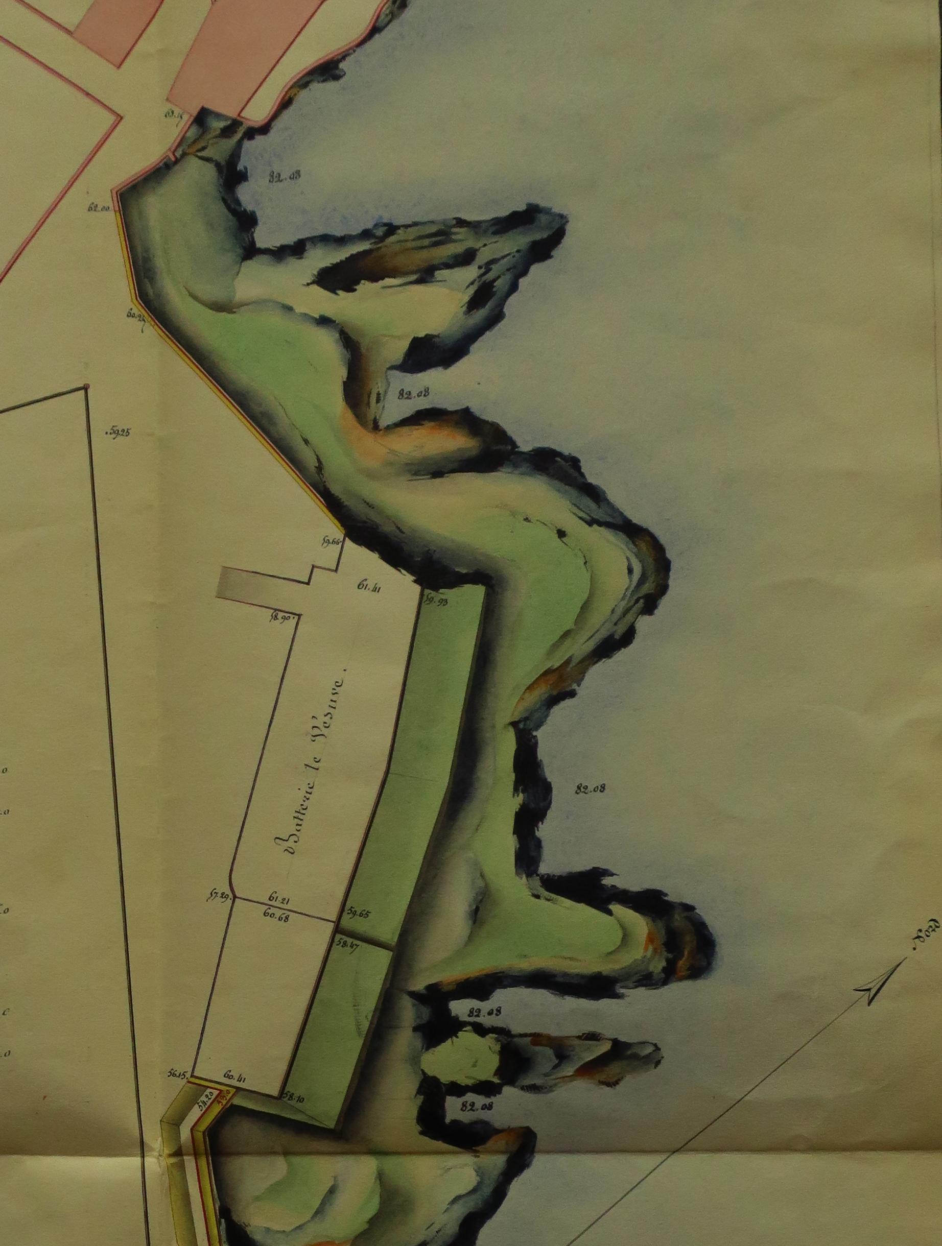 Service historique de la Défense, département Armée de Terre, Vincennes. Archives du Génie ; Article 8, Places françaises et d'Algérie : 1 VH 291, Place de Belle-Île-en-Mer, projets et dépenses annuels, 1843-1846. Direction du Génie de Nantes, Place de Belle-Ile, feuille n° 3 des projets pour 1843, escarpement de la côte, pour fermer la place entre le port et l'extrémité de la coupure 18, 29 mars 1843.