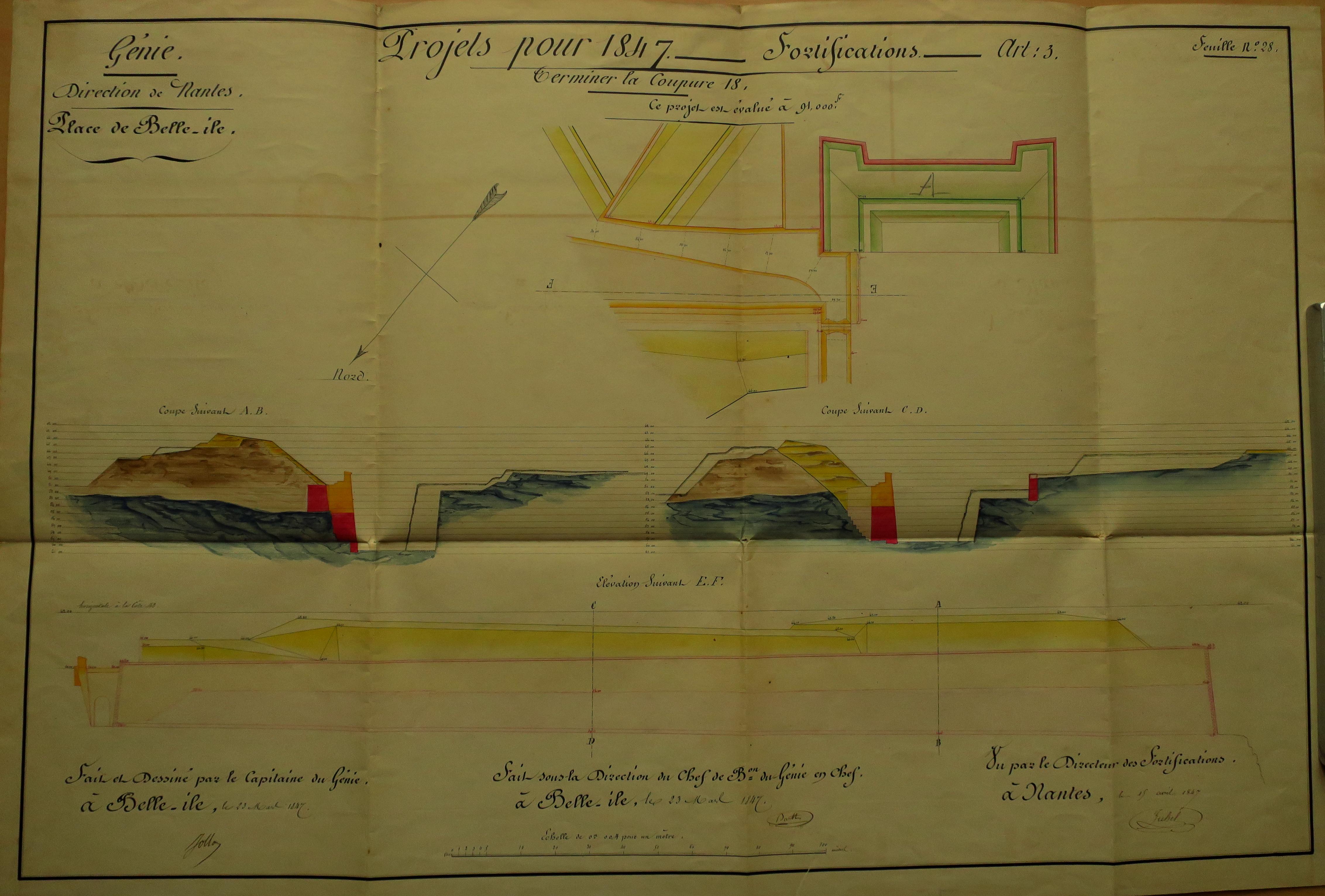 Service historique de la Défense, département Armée de Terre, Vincennes. Archives du Génie ; Article 8, Places françaises et d'Algérie : 1 VH 292, Place de Belle-Île-en-Mer, projets et dépenses annuels, 1847. Direction du Génie de Nantes, Place de Belle-Ile, feuille n° 28 des projets pour 1847, terminer la coupure 18, 23 mars 1847.