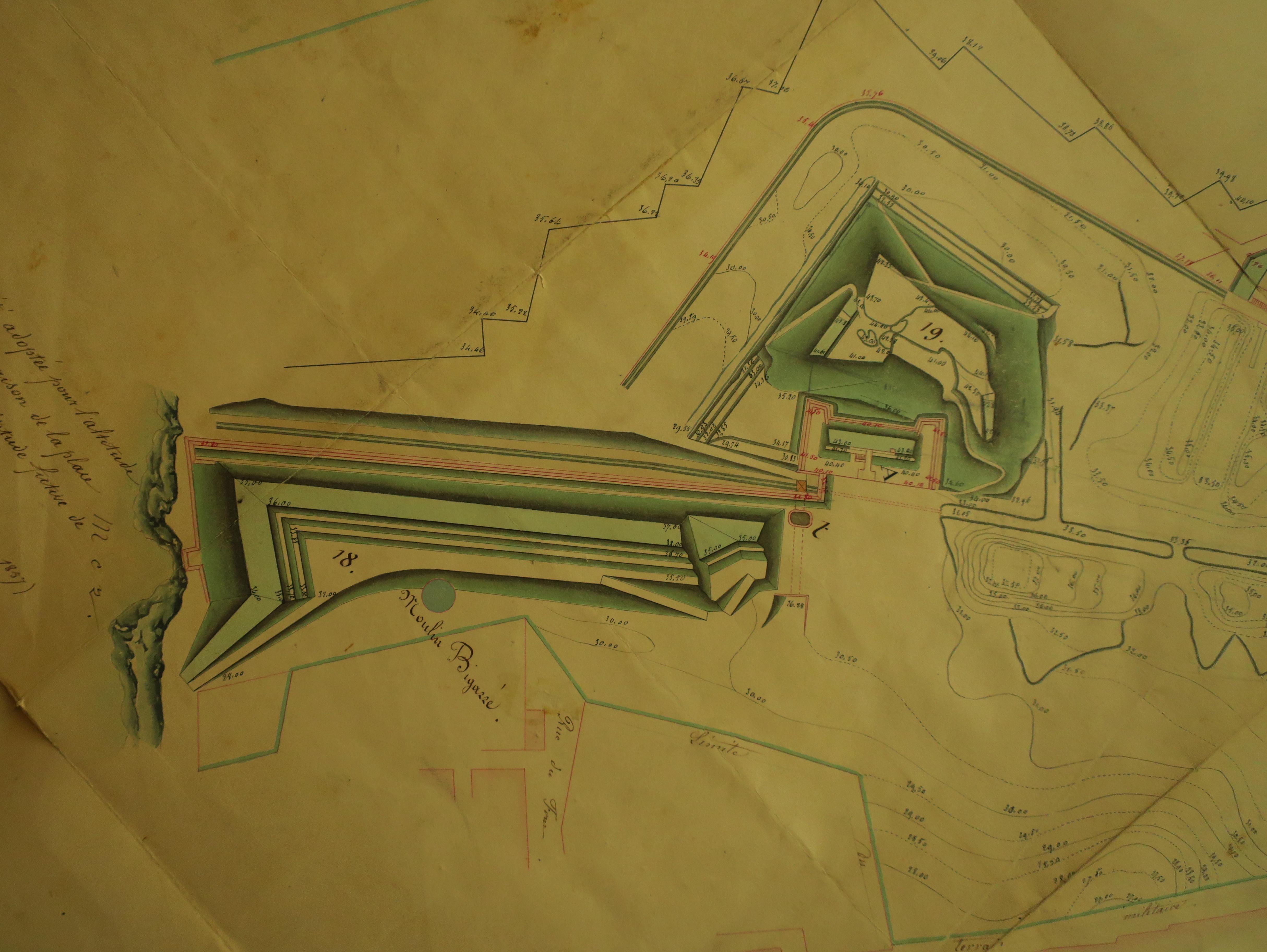 Service historique de la Défense, département Armée de Terre, Vincennes. Archives du Génie ; Article 8, Places françaises et d'Algérie : 1 VH 295, Place de Belle-Île-en-Mer, projets et dépenses annuels, 1858-1859. Direction du Génie de Brest, Place de Belle-Ile, feuille n° 1 des projets pour 1856-1857, état actuel des lieux, 29 décembre 1857.