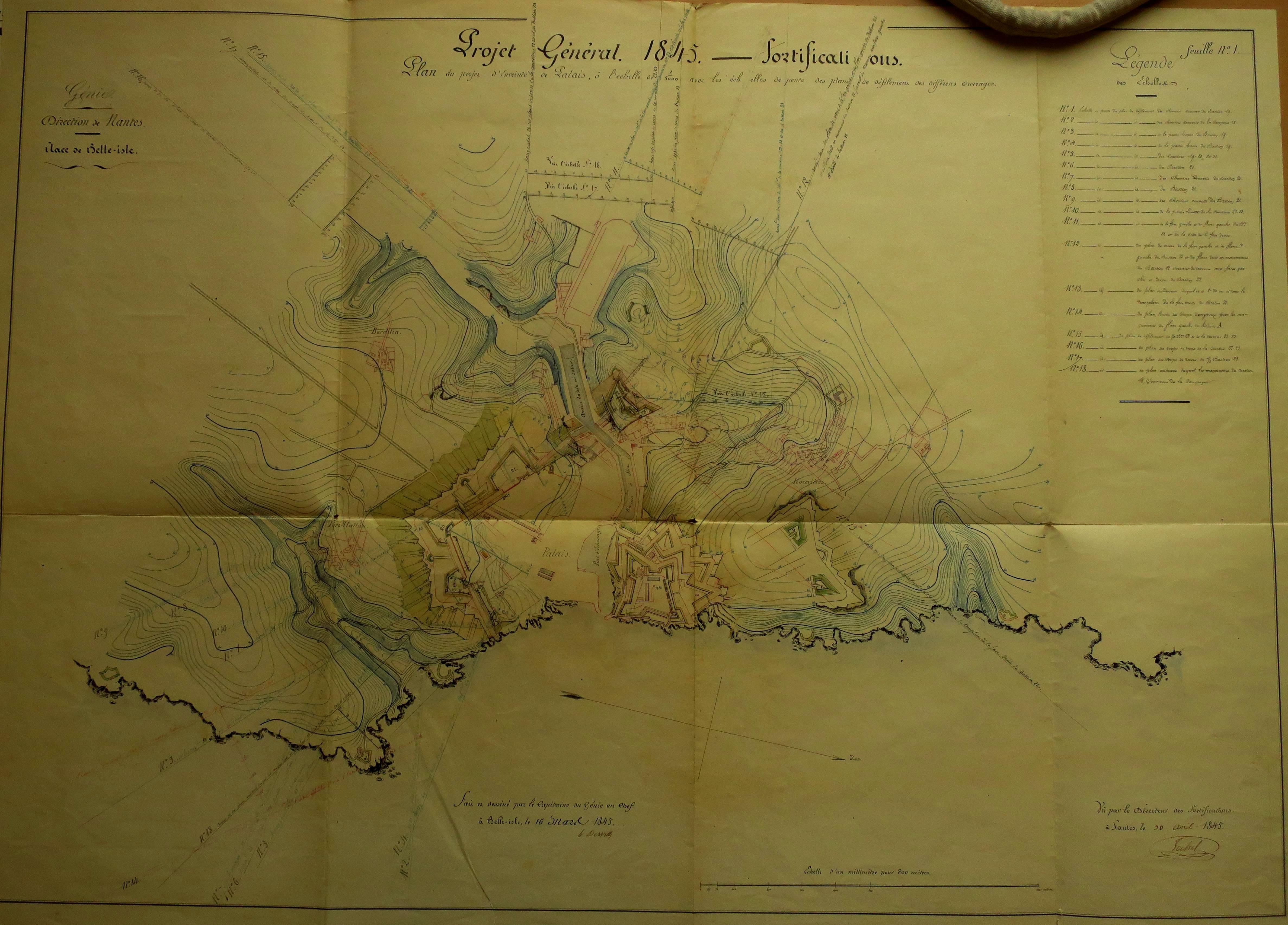 Service historique de la Défense, département Armée de Terre, Vincennes. Archives du Génie ; Article 8, Places françaises et d'Algérie : 1 VH 291, Place de Belle-Île-en-Mer, projets et dépenses annuels, 1843-1846. Direction du Génie de Nantes, Place de Belle-Ile, feuille n° 1 des projets pour 1845, plan du projet d'enceinte de Palais, 16 mars 1845.