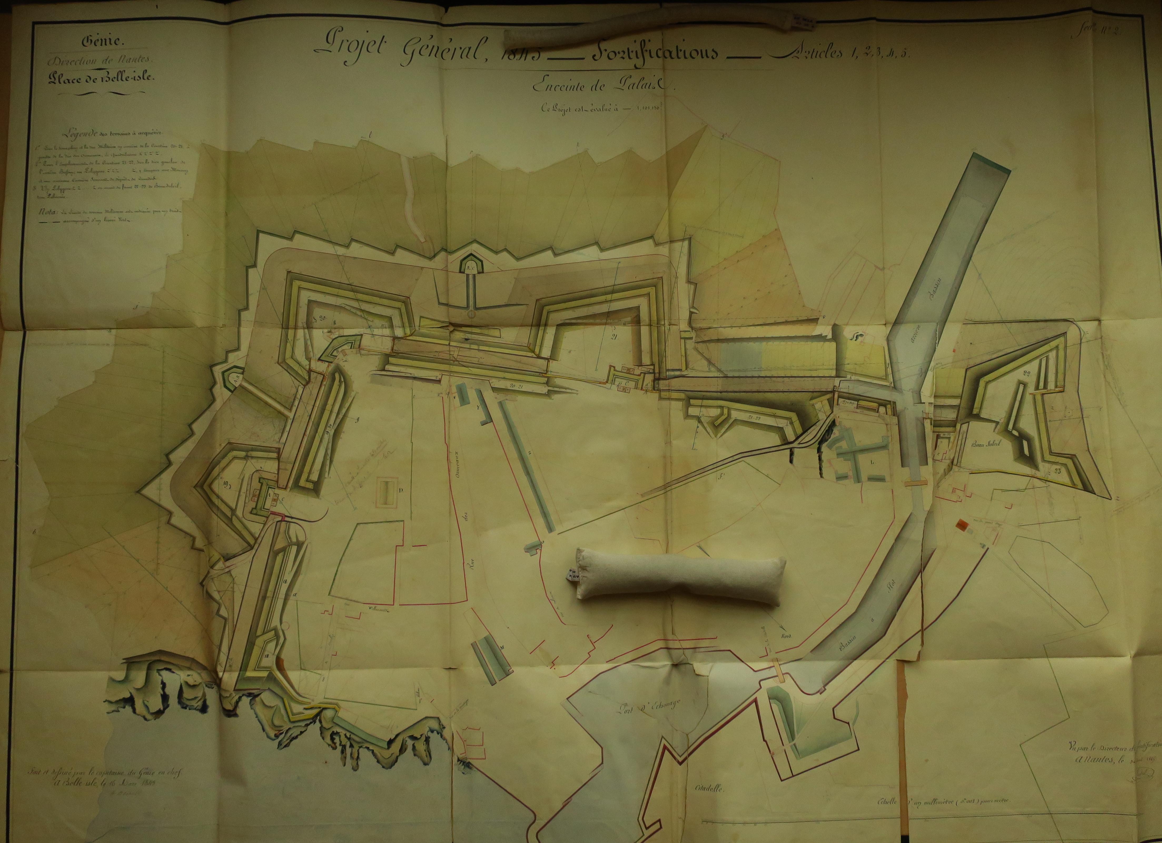 Service historique de la Défense, département Armée de Terre, Vincennes. Archives du Génie ; Article 8, Places françaises et d'Algérie : 1 VH 291, Place de Belle-Île-en-Mer, projets et dépenses annuels, 1843-1846. Direction du Génie de Nantes, Place de Belle-Ile, feuille n° 2 des projets pour 1845, enceinte de Palais, 16 mars 1845.