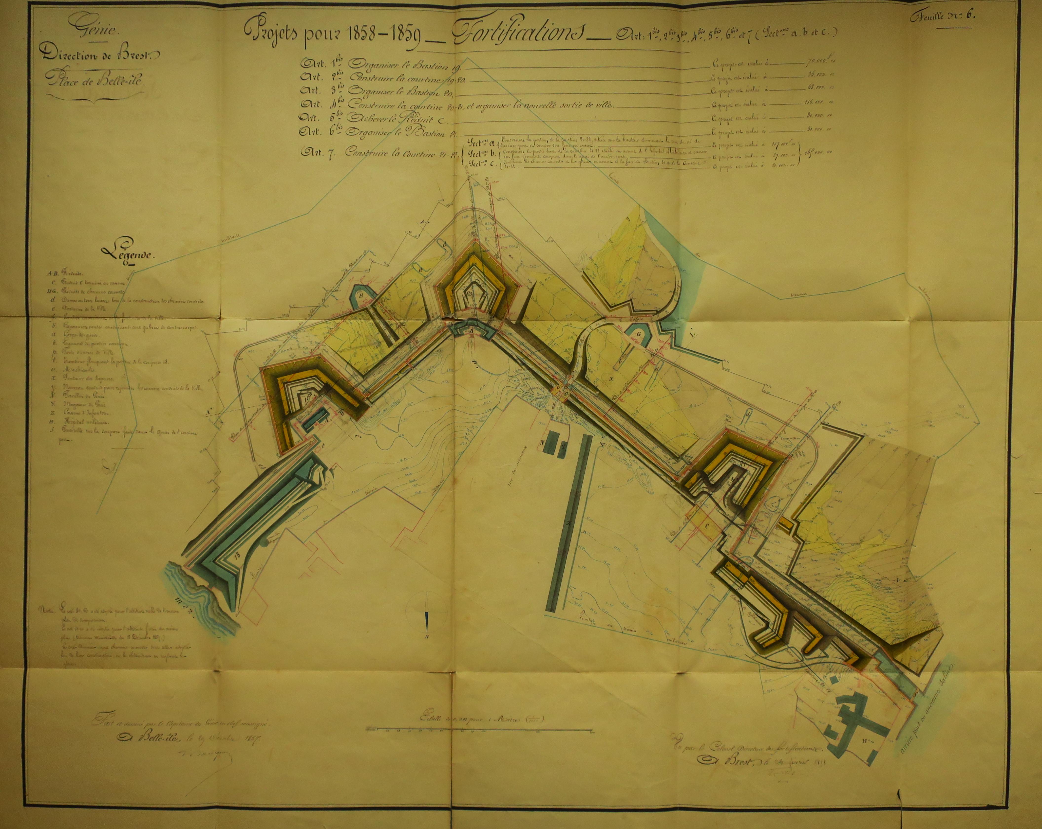 Service historique de la Défense, département Armée de Terre, Vincennes. Archives du Génie ; Article 8, Places françaises et d'Algérie : 1 VH 295, Place de Belle-Île-en-Mer, projets et dépenses annuels, 1858-1859. Direction du Génie de Brest, Place de Belle-Ile, feuille n° 6 des projets pour 1858-1859, 29 décembre 1857.