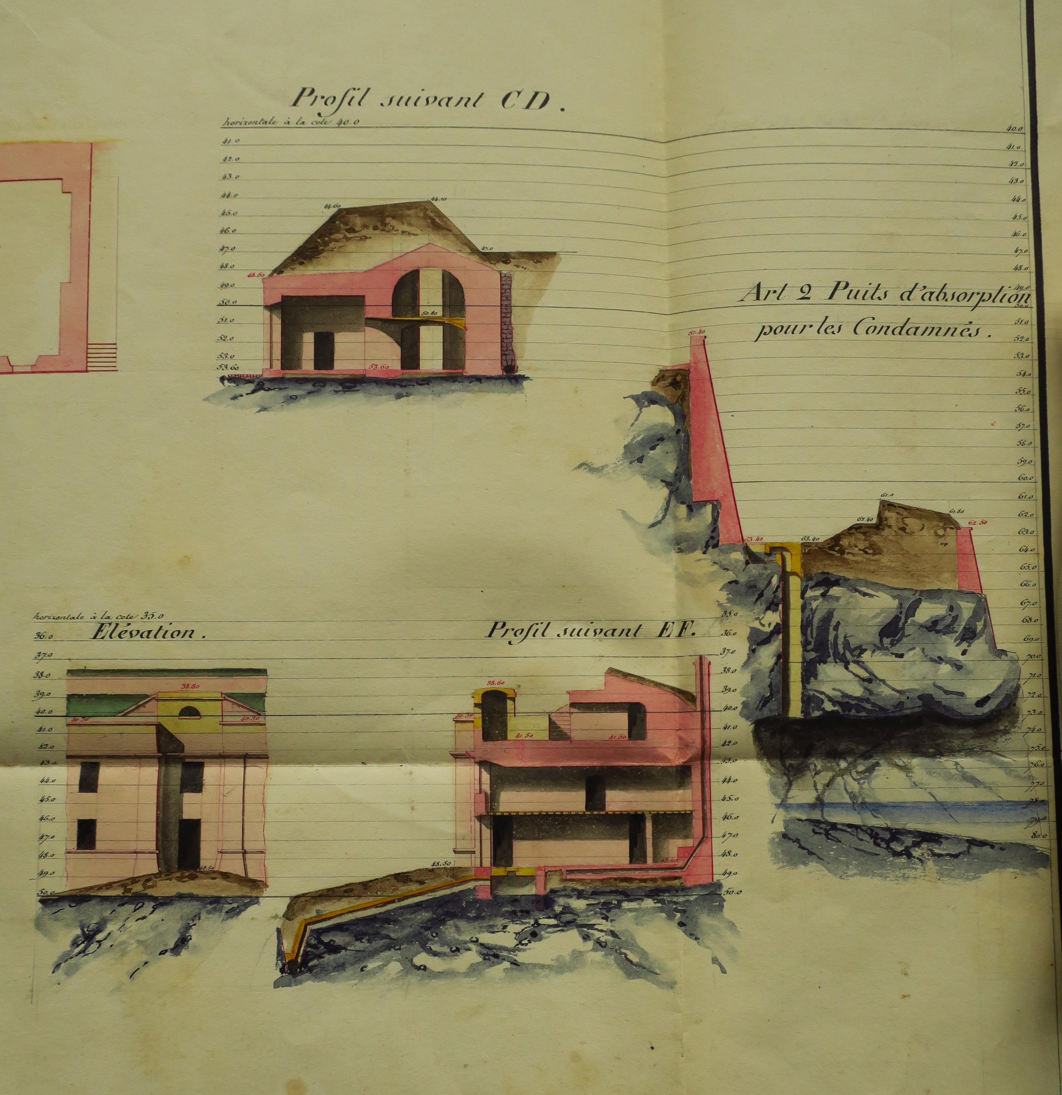 Service historique de la Défense, département Armée de Terre, Vincennes. Archives du Génie ; Article 8, Places françaises et d'Algérie : 1 VH 290, Place de Belle-Île-en-Mer, projets et dépenses annuels, 1837-1842. Direction du Génie de Nantes, Place de Belle-Ile, feuille n° 10 des projets pour 1841, améliorations au casernement, 27 février 1841.