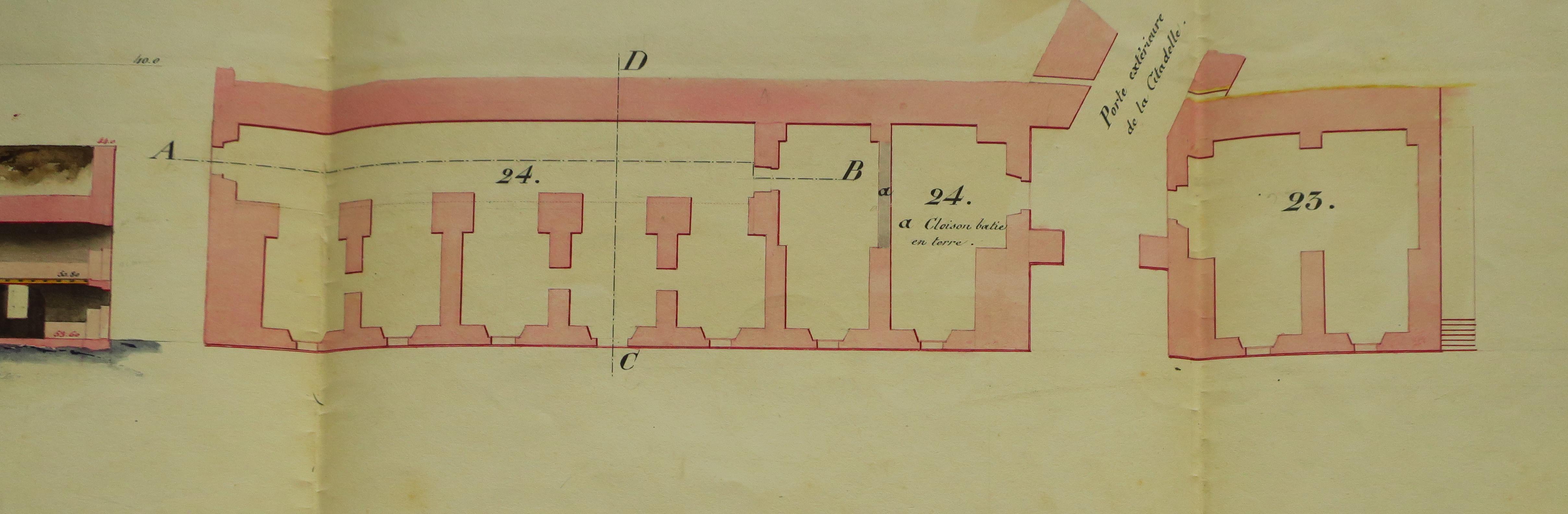 Service historique de la Défense, département Armée de Terre, Vincennes. Archives du Génie ; Article 8, Places françaises et d'Algérie : 1 VH 290, Place de Belle-Île-en-Mer, projets et dépenses annuels, 1837-1842. Direction du Génie de Nantes, Place de Belle-Ile, feuille n° 10 des projets pour 1841, améliorations au casernement, 27 février 1841.