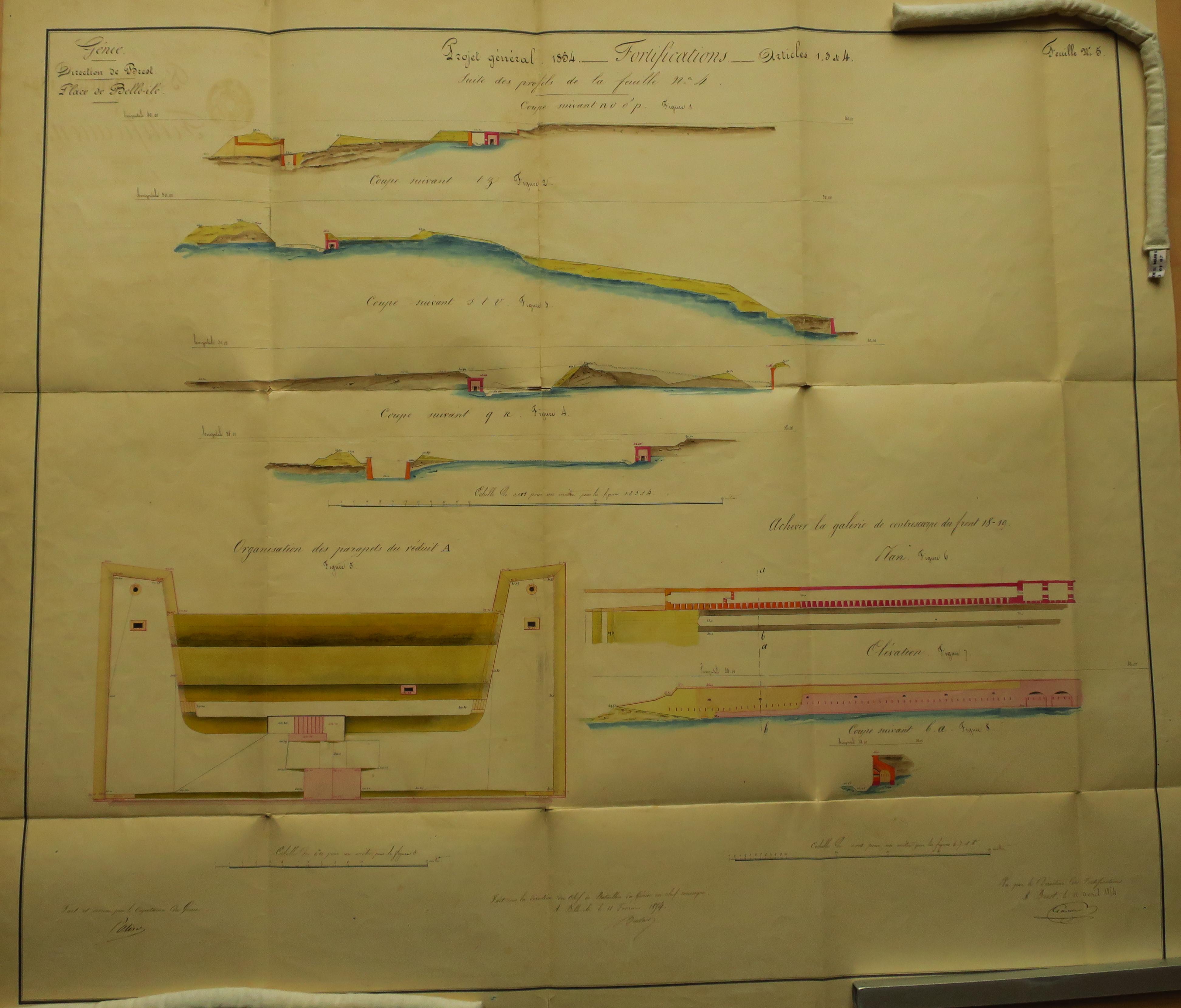 Service historique de la Défense, département Armée de Terre, Vincennes. Archives du Génie ; Article 8, Places françaises et d'Algérie : 1 VH 294, Place de Belle-Île-en-Mer, projets et dépenses annuels, 1854-1857. Direction du Génie de Brest, Place de Belle-Ile, feuille n° 4 des projets pour 1854-1855, 11 février 1854.