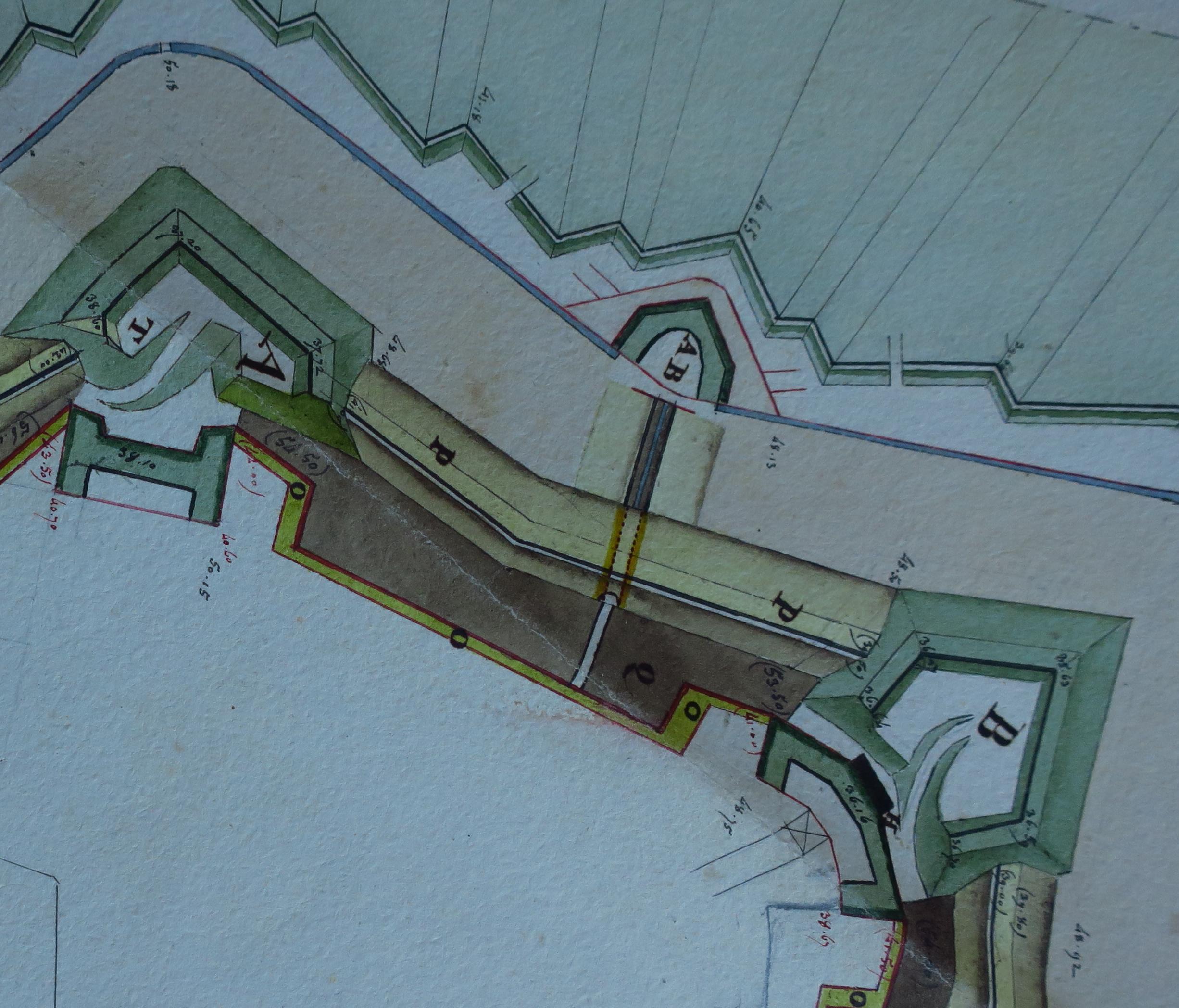 Service historique de la Défense, département Armée de Terre, Vincennes. Archives du Génie ; Article 8, Places françaises et d'Algérie : 1 VH 289, Place de Belle-Île-en-Mer, projets et dépenses annuels, 1831-1836. Direction du Génie de Nantes, Place de Belle-isle-en-Mer, feuille n° 1 des projets pour 1831, projet d'ensemble pour la place de Palais, 1er mars 1831.