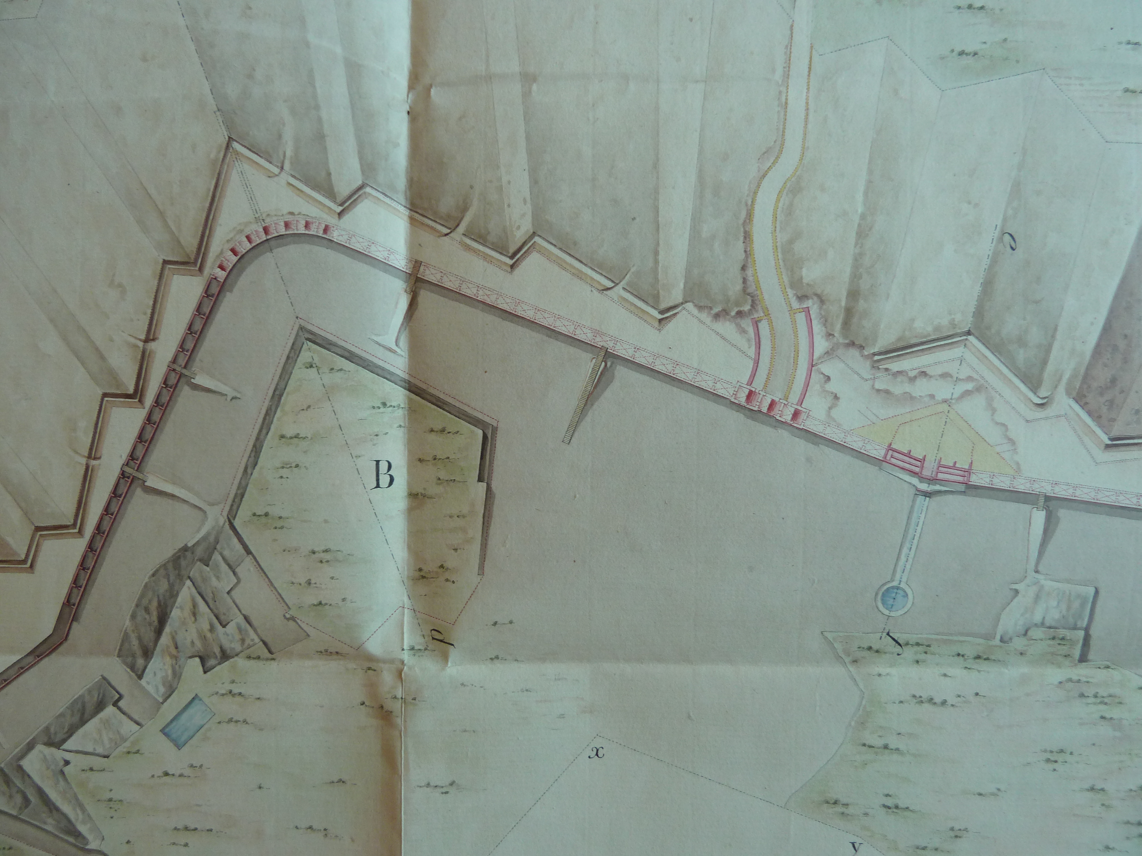 Service historique de la Défense, département Armée de Terre, Vincennes. Archives du Génie ; Article 8, Places françaises et d'Algérie : 1 VH 286, Place de Belle-Île-en-Mer, projets et dépenses annuels, 1807-1816. Direction du Génie de Port-Liberté, plan indicatif de la situation au 1er janvier 1807 des ouvrages entrepris sur le plateau au sud de la citadelle de Belle-Isle.