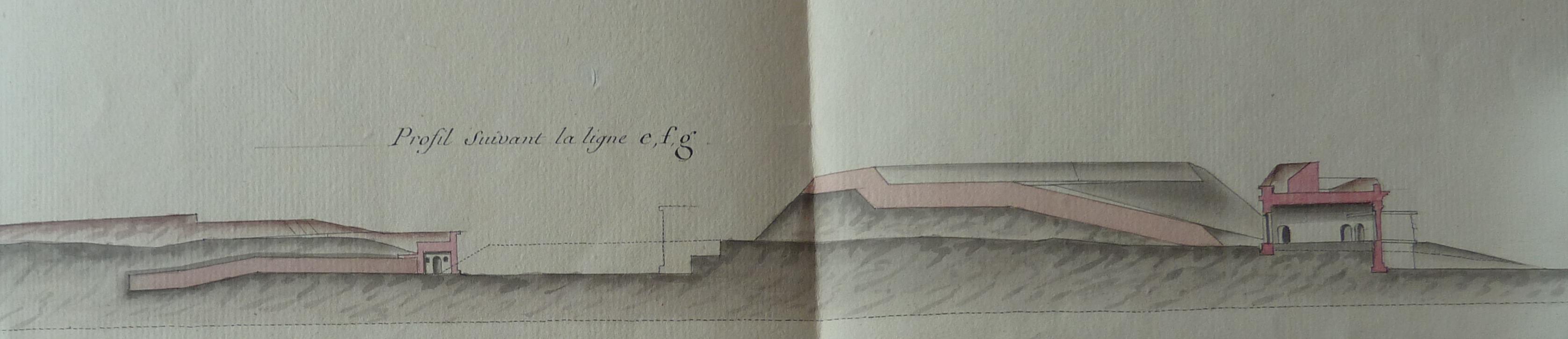 Service historique de la Défense, département Armée de Terre, Vincennes. Archives du Génie ; Article 8, Places françaises et d'Algérie : 1 VH 286, Place de Belle-Île-en-Mer, projets et dépenses annuels, 1807-1816. Direction du Génie de Port-Louis, Place de Belle-Ile-en-Mer, ouvrages au sud de la citadelle, situation au 1er octobre 1811, profils.