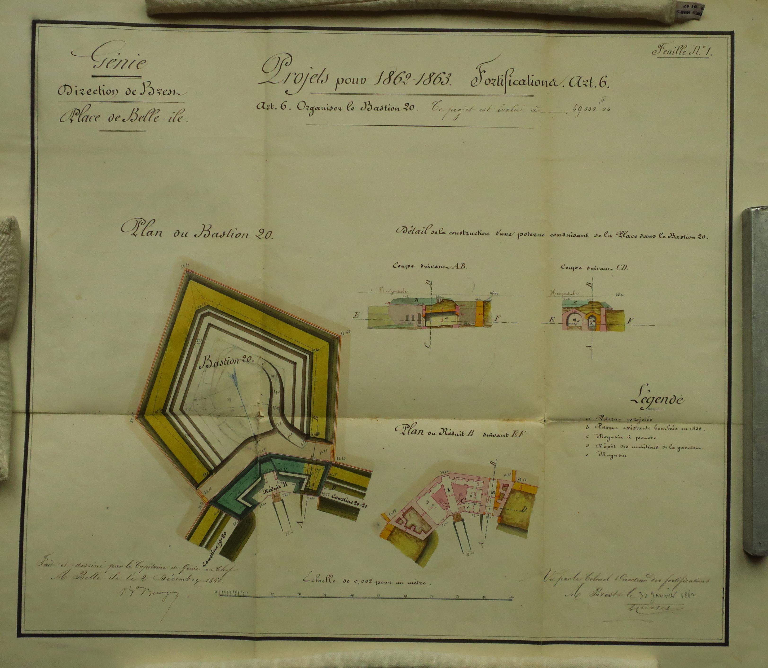 Service historique de la Défense, département Armée de Terre, Vincennes. Archives du Génie ; Article 8, Places françaises et d'Algérie : 1 VH 297, Place de Belle-Île-en-Mer, projets et dépenses annuels, 1862-1875. Direction du Génie de Brest, Place de Belle-Ile, feuille n° 1 des projets pour 1862-1863, organiser le bastion 20, 2 décembre 1861.