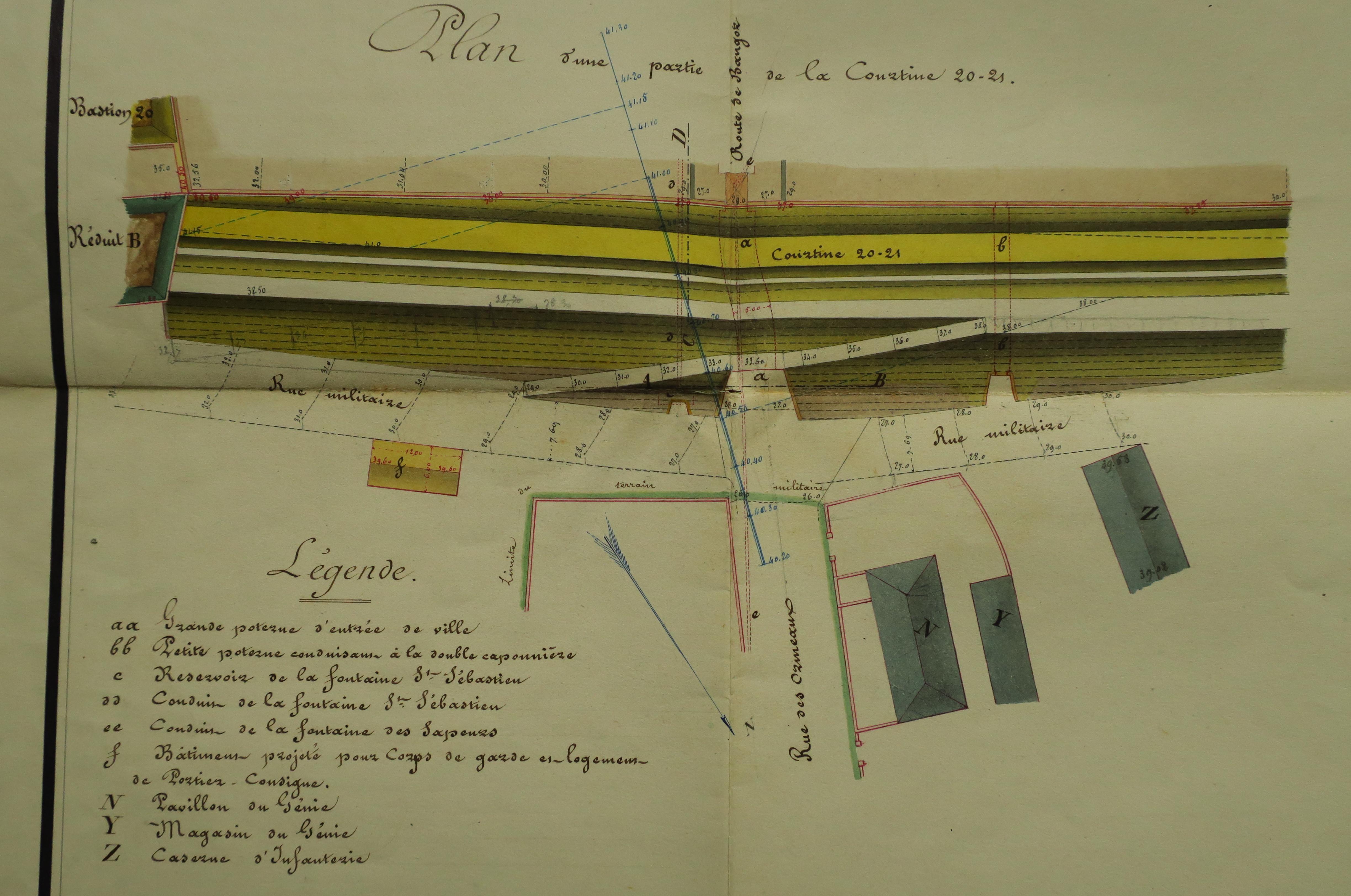 Service historique de la Défense, département Armée de Terre, Vincennes. Archives du Génie ; Article 8, Places françaises et d'Algérie : 1 VH 297, Place de Belle-Île-en-Mer, projets et dépenses annuels, 1862-1875. Direction du Génie de Brest, Place de Belle-Ile, feuille n° 2 des projets pour 1862-1863, modification proposée par le chef du génie pour l'organisation de la poterne d'entrée de ville à travers la courtine 20-21