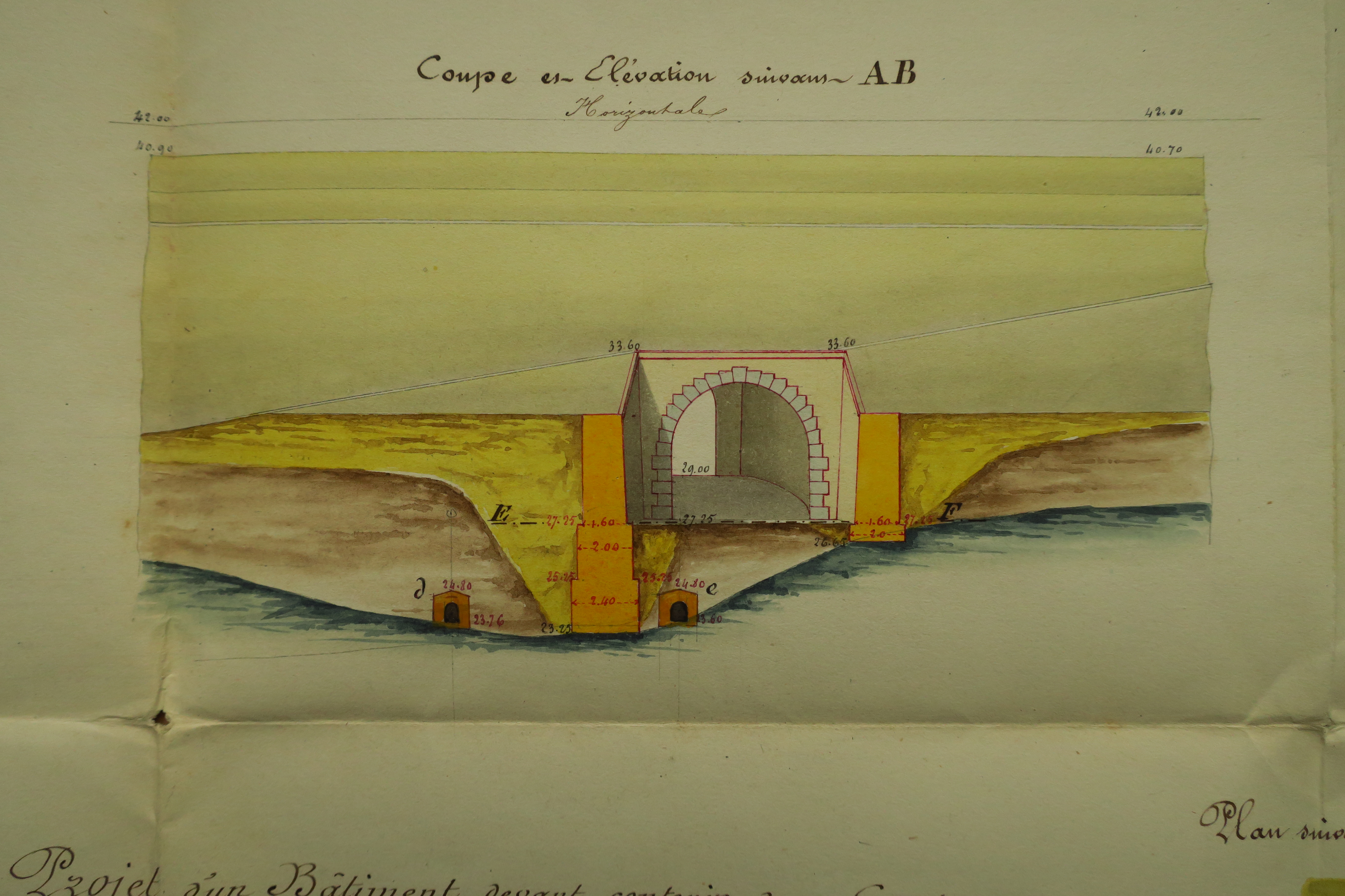 Service historique de la Défense, département Armée de Terre, Vincennes. Archives du Génie ; Article 8, Places françaises et d'Algérie : 1 VH 297, Place de Belle-Île-en-Mer, projets et dépenses annuels, 1862-1875. Direction du Génie de Brest, Place de Belle-Ile, feuille n° 2 des projets pour 1862-1863, modification proposée par le chef du génie pour l'organisation de la poterne d'entrée de ville à travers la courtine 20-21