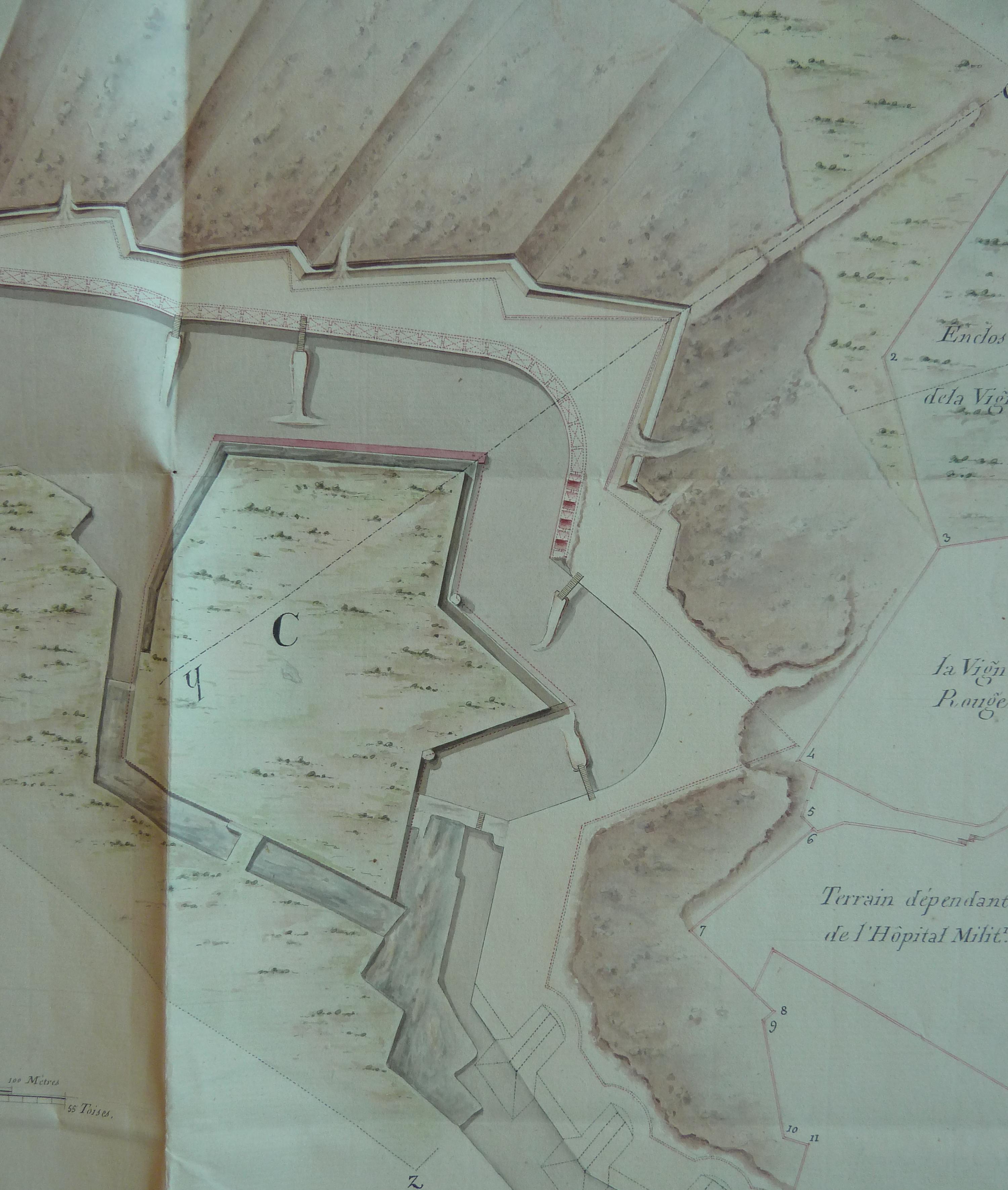 Service historique de la Défense, département Armée de Terre, Vincennes. Archives du Génie ; Article 8, Places françaises et d'Algérie : 1 VH 286, Place de Belle-Île-en-Mer, projets et dépenses annuels, 1807-1816. Direction du Génie de Port-Liberté, plan indicatif de la situation au 1er janvier 1807 des ouvrages entrepris sur le plateau au sud de la citadelle de Belle-Isle.